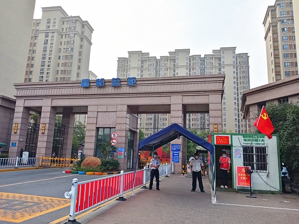 防疫小区晶都茗苑的门岗,党旗在高高飘扬。酷夏的微风送来的不是丝丝凉意,而是热浪袭袭。齐民路社区党总支认真落实包保责任,实施“一张网”管控,通过9个网格管理,强化社区疫情防控,形成“街-社-网”三级包保责任机制,全力做好“内防扩散、外防输出”。