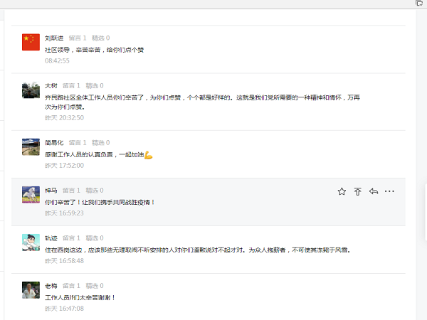 《致歉信》一出,立马得到许多居民的关注和转发,阅读量和留言量成为了齐民路社区微信公众号“爱我齐民”的历史新高,这一反响也让社区感到惊讶和激动。防疫以来,社区和居民似乎成了对立面,社区是管理者、居民是服从者,然而《致歉信》言辞平和、娓娓道来,将一件件防疫中的“委屈”向居民细细阐述着,真诚相待和真情流露,让居民也从中明白社区的不易,在防疫大考中社区只是服务者、志愿者,居民才是受益者。