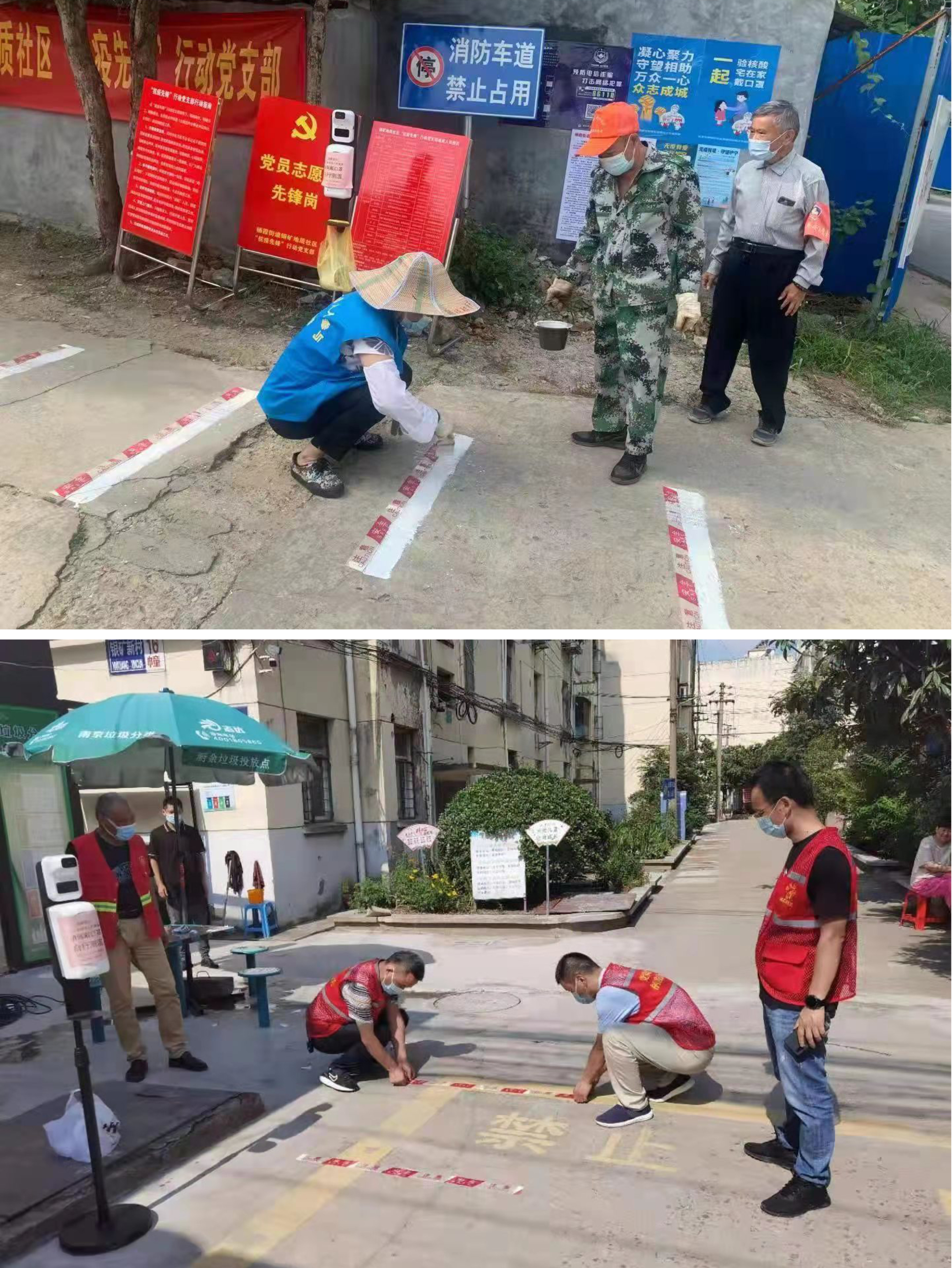 为了切实做好疫情防控工作,引导居民保持一米社交距离,近日,南京市栖霞区栖霞街道银矿地质社区城市治理志愿者在辖区小区入口处划设一米警戒线。