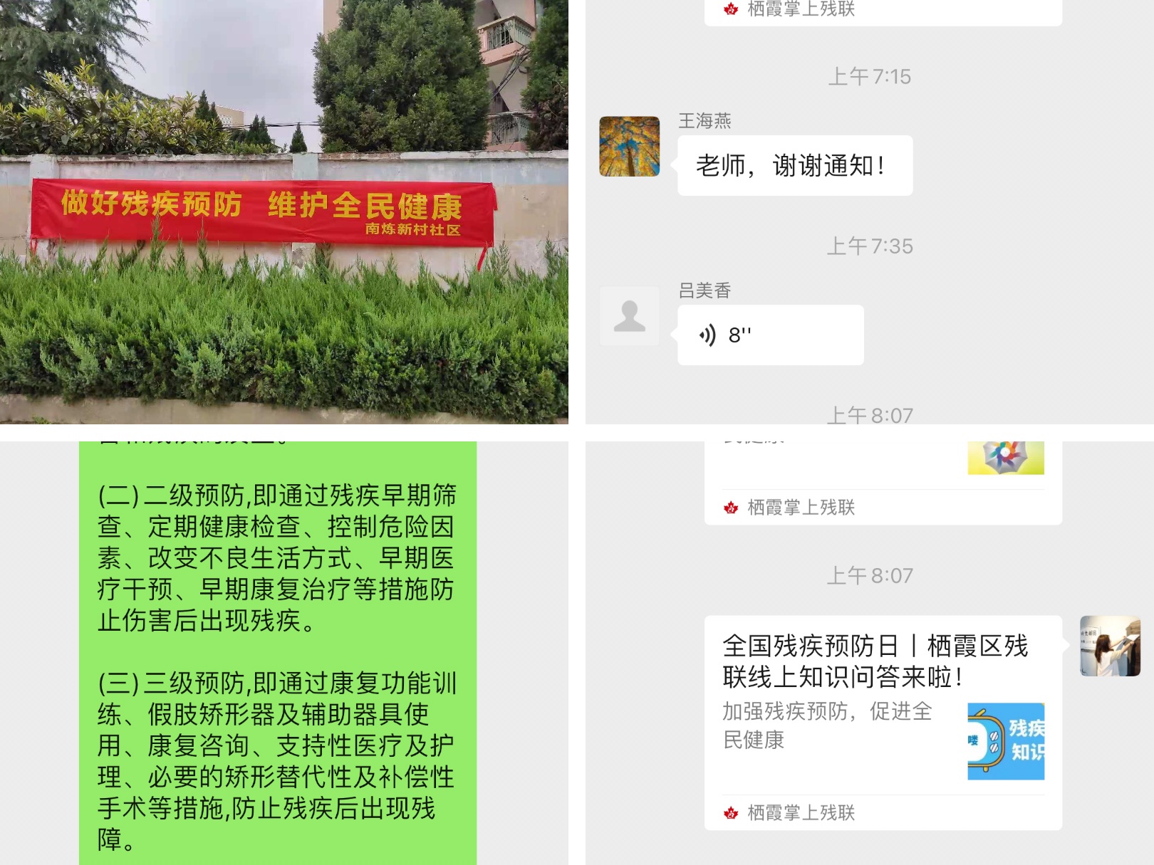 2021年8月25日是第五个残疾预防日,为进一步加强残疾预防宣传教育,增强社区残疾预防意识,8月23日,南炼新村社区居民学校联合滨江社区、南炼新村社区残疾人之家开展主题为“加强残疾预防,促进全民健康”的线上读书分享会,引导社区居民不断增强残疾预防意识,人人尽责、人人行动,加强残疾预防,争做自己健康的主人。