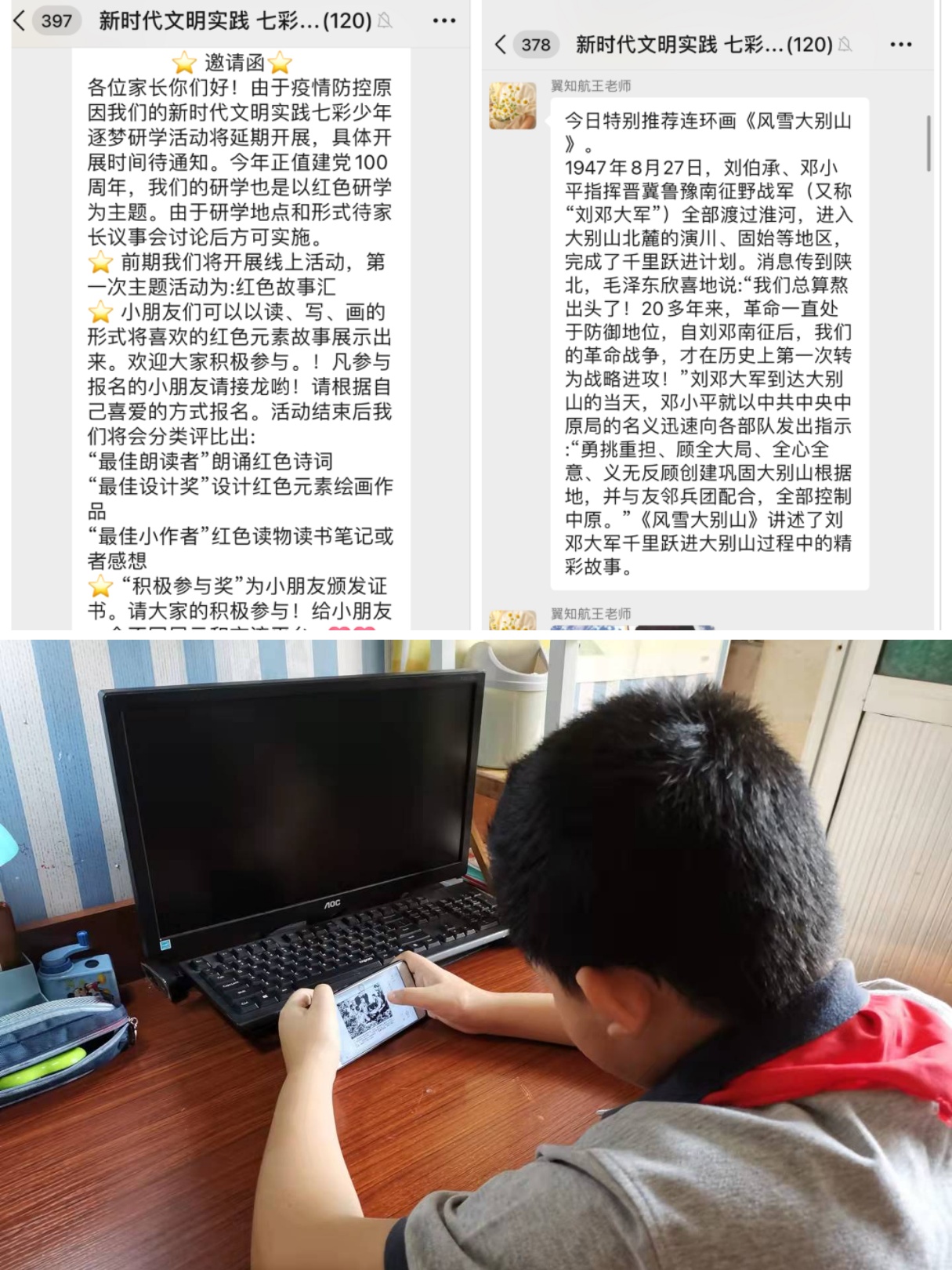 红船迎风起,重温革命情。在庆祝中国共产党成立100周年之际,社区居民学校在微信群内每日推荐一篇由真实历史故事记录的连环画,《红船》、《草地晚餐》、《家》、《风雪大别山》等经典故事,都令孩子们印象深刻。革命先辈们坚持真理、忠于信仰,早已将个人生死置之度外,将青春、将生命都奉献给了新中国。百年前掷地有声的青春之声,通过书篇传递给每一位南炼新村社区七彩少年,成为回荡社区孩子们心中的声音。