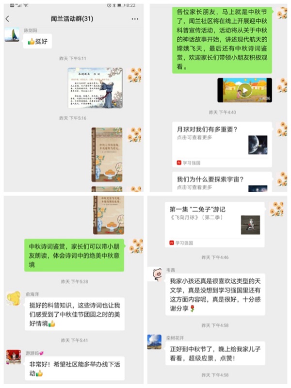 中秋线上科普宣传活动吸引了群内的家长们积极参与,他们带领小朋友们一起开启探索月球奥秘之旅,一起赏析古诗词,一起传承中秋文化。同时,学习强国平台的使用也让家长们发掘了一个全新的学习宝藏,亲子共同学习之路将有更多学习资源相伴。