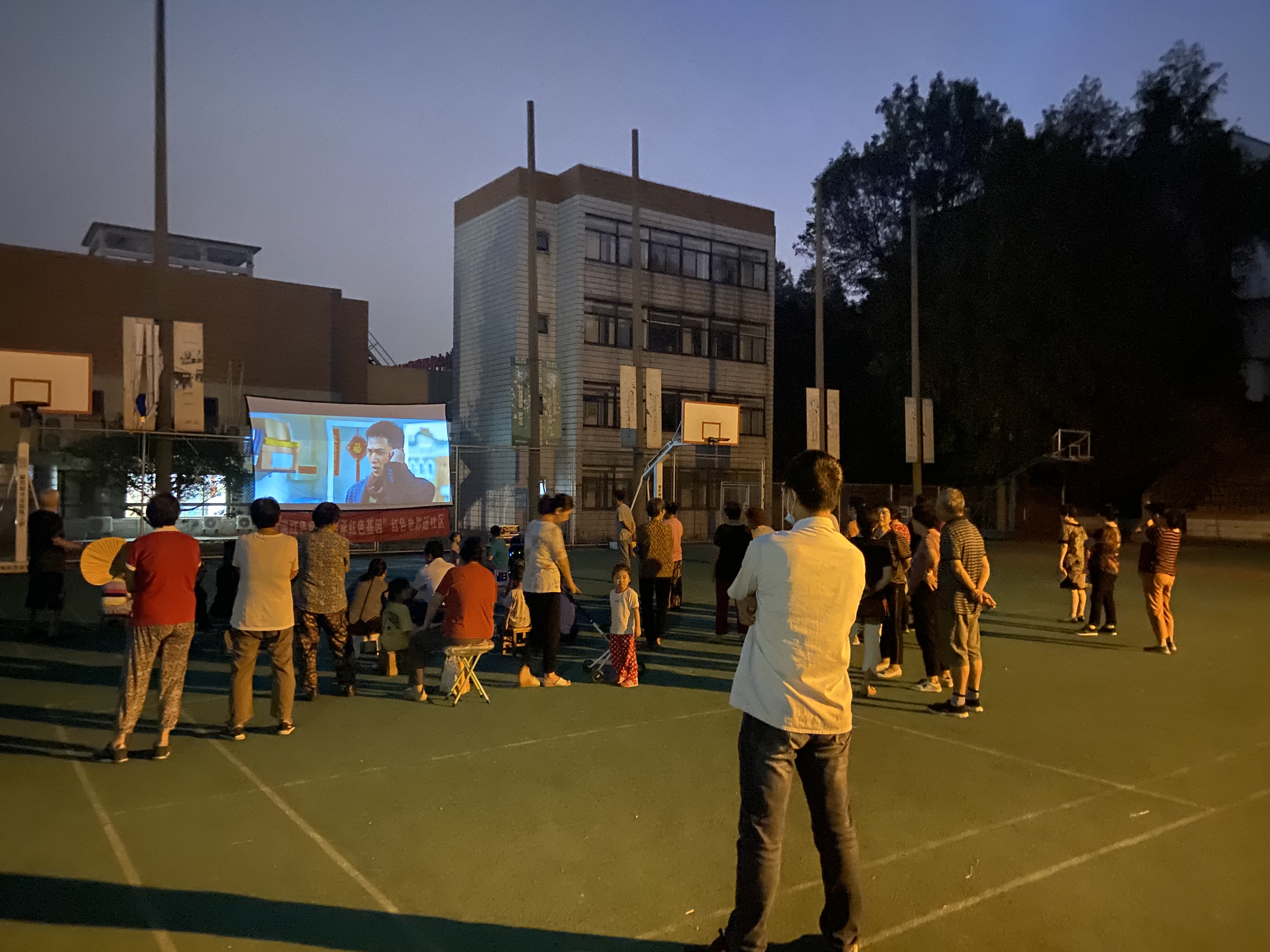 放映现场,原本空荡荡的广场陆陆续续来了许多前来观影的居民,有的小朋友拿着小椅子,端坐在一起,津津有味地欣赏着。