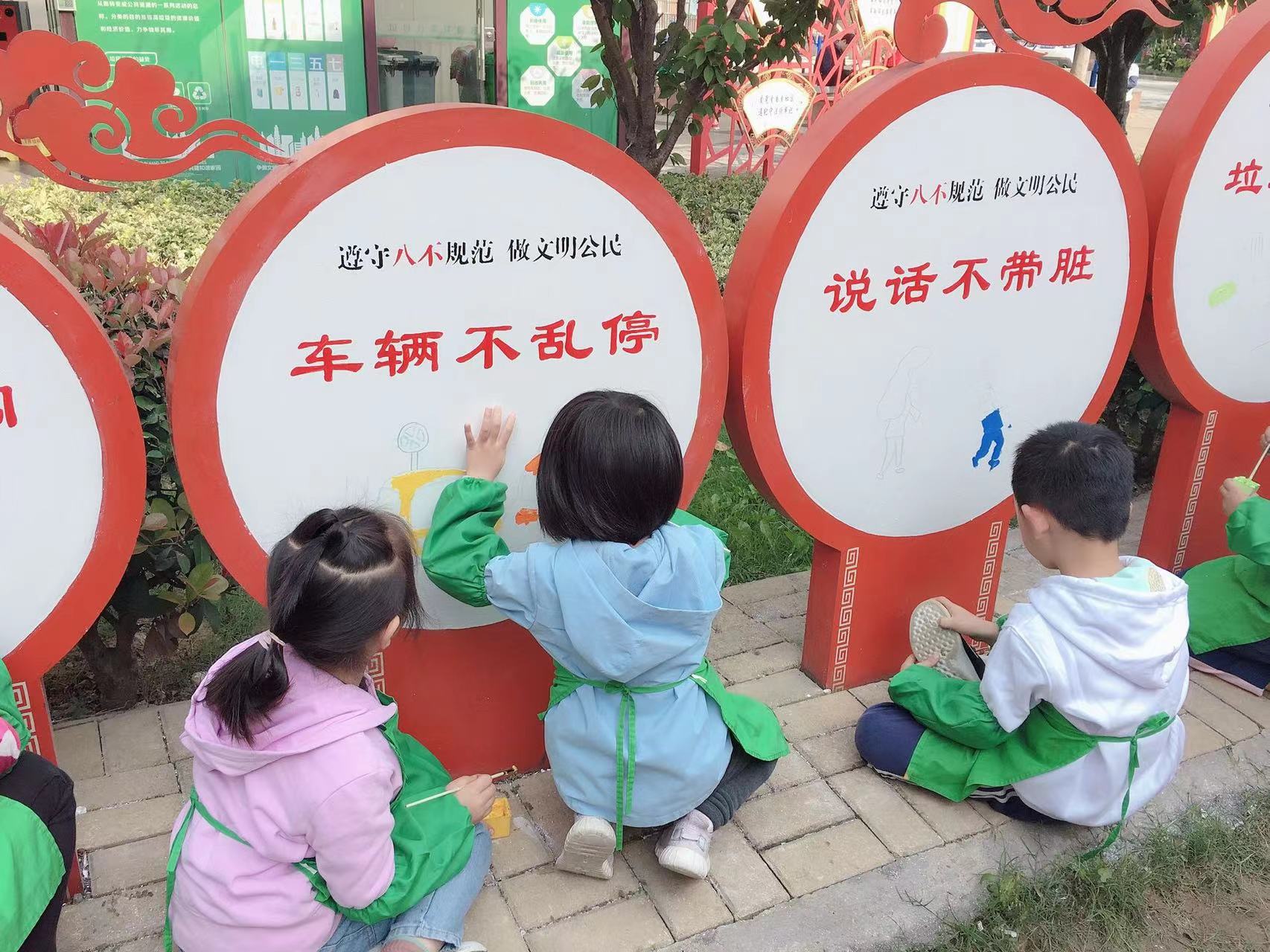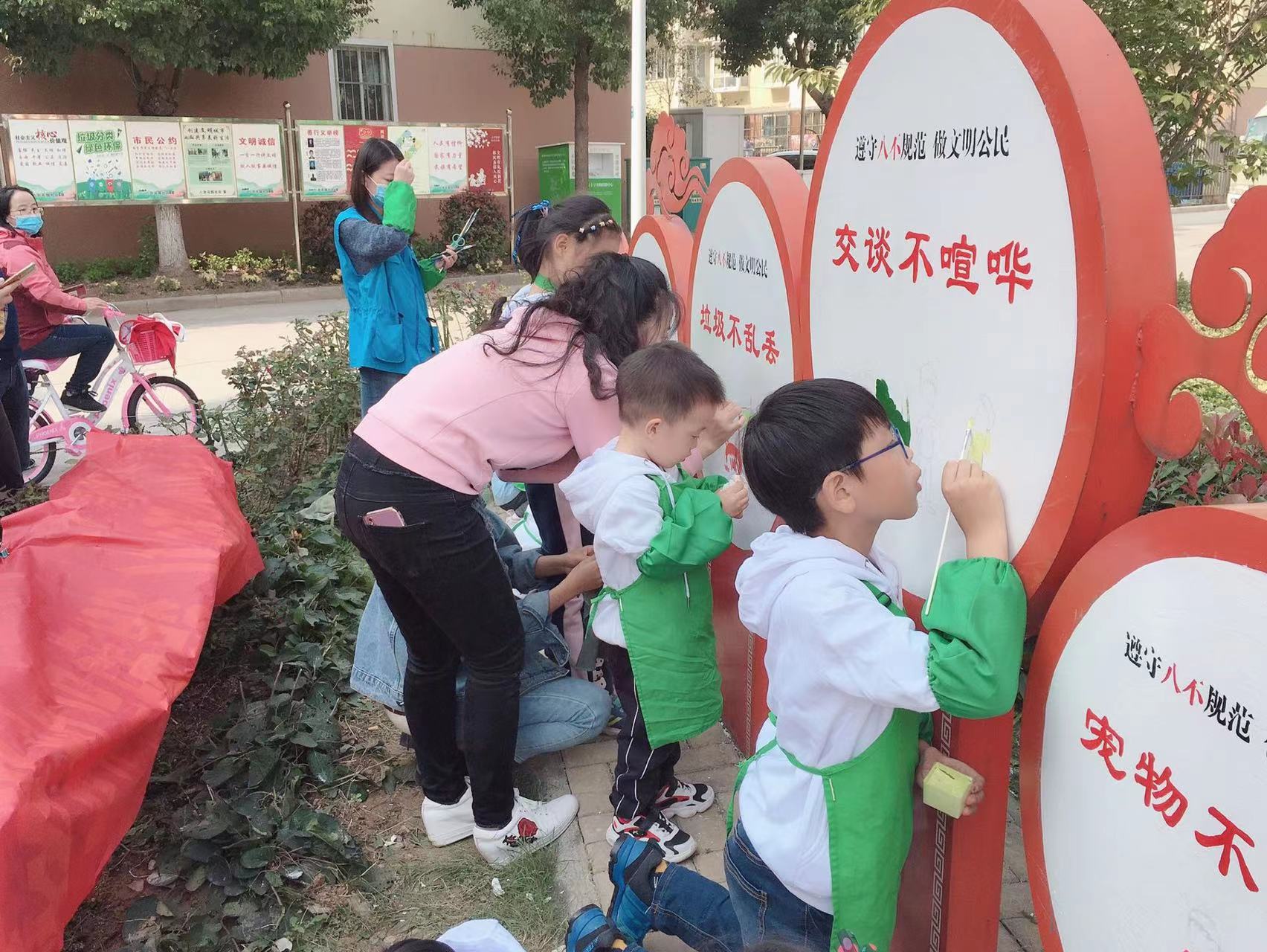 活动通过召集小朋友,用自己的双手将景观小品“八不规范”、“社会主义核心价值观”等通过绘画的方式展现出来。活动伊始,小朋友们蓄势待发,穿上绘画护服,手拿颜料和画笔,描绘图案、填充颜色,将原来易损坏的宣传板变成精神文明宣传的新视窗、文明创建的新阵地。营造更好的文明环境,让环境教育人、感化人,让环境成为社区居民的无声老师。