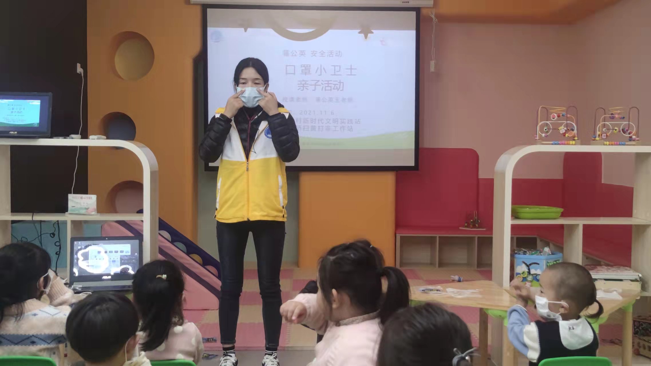 为提升小朋友们的预防疾病的意识,传播科学健康知识,11月6日,栖霞街道石埠桥村社区居民学校联合新时代文明实践站、石埠桥“扫黄打非“工作站在石埠湾亲子室开展“口罩小卫士”亲子活动,活动吸引了20个亲子家庭前来参与。