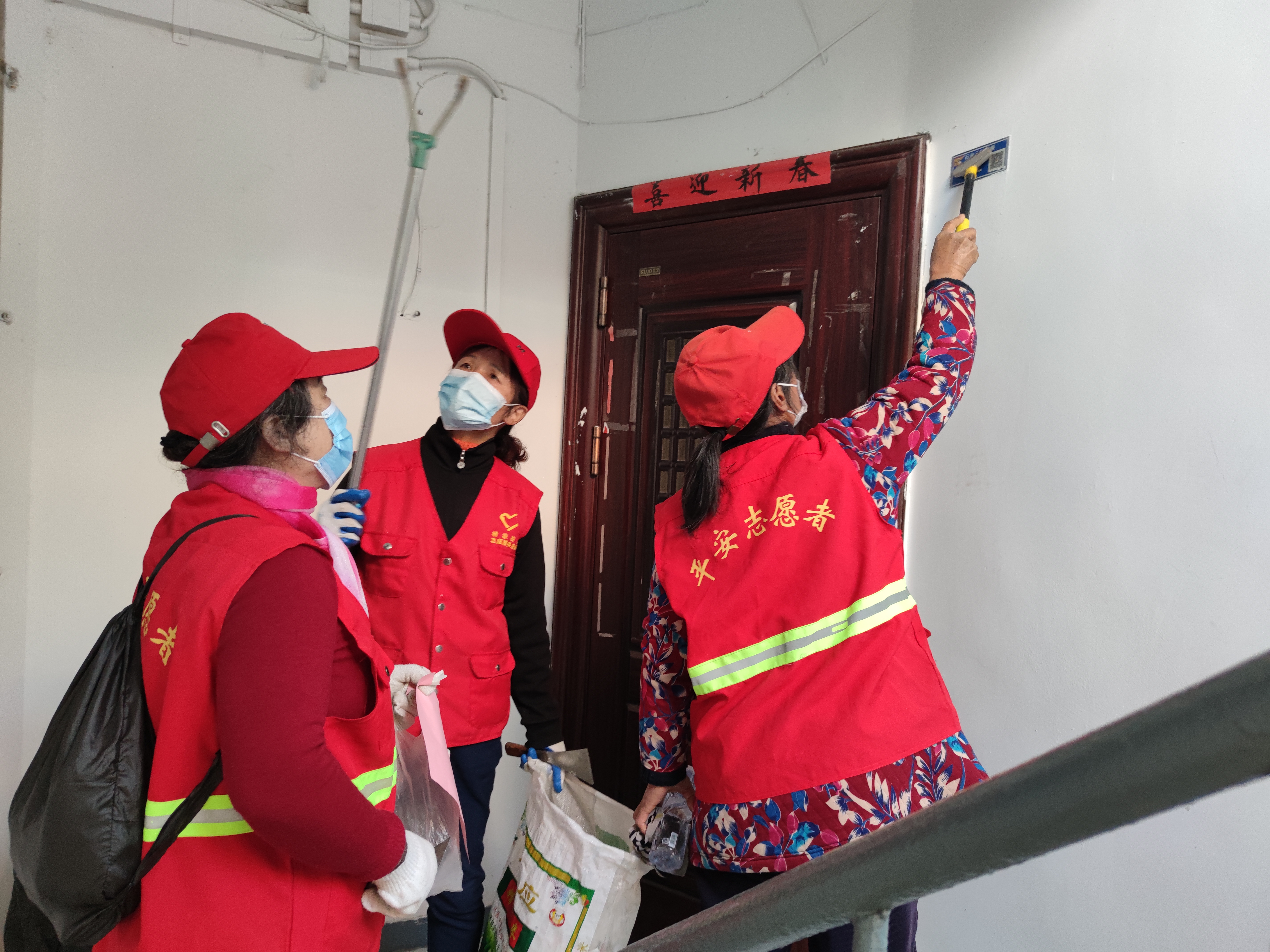“来,我们把这个小广告铲一下……”栖霞区栖霞街道南炼新村社区“幸福由我”老党员工作室银发“洁”忧队的核心成员龚桂香正带领着其他党员志愿者共同对楼道内的杂物、小广告开展环境整治。