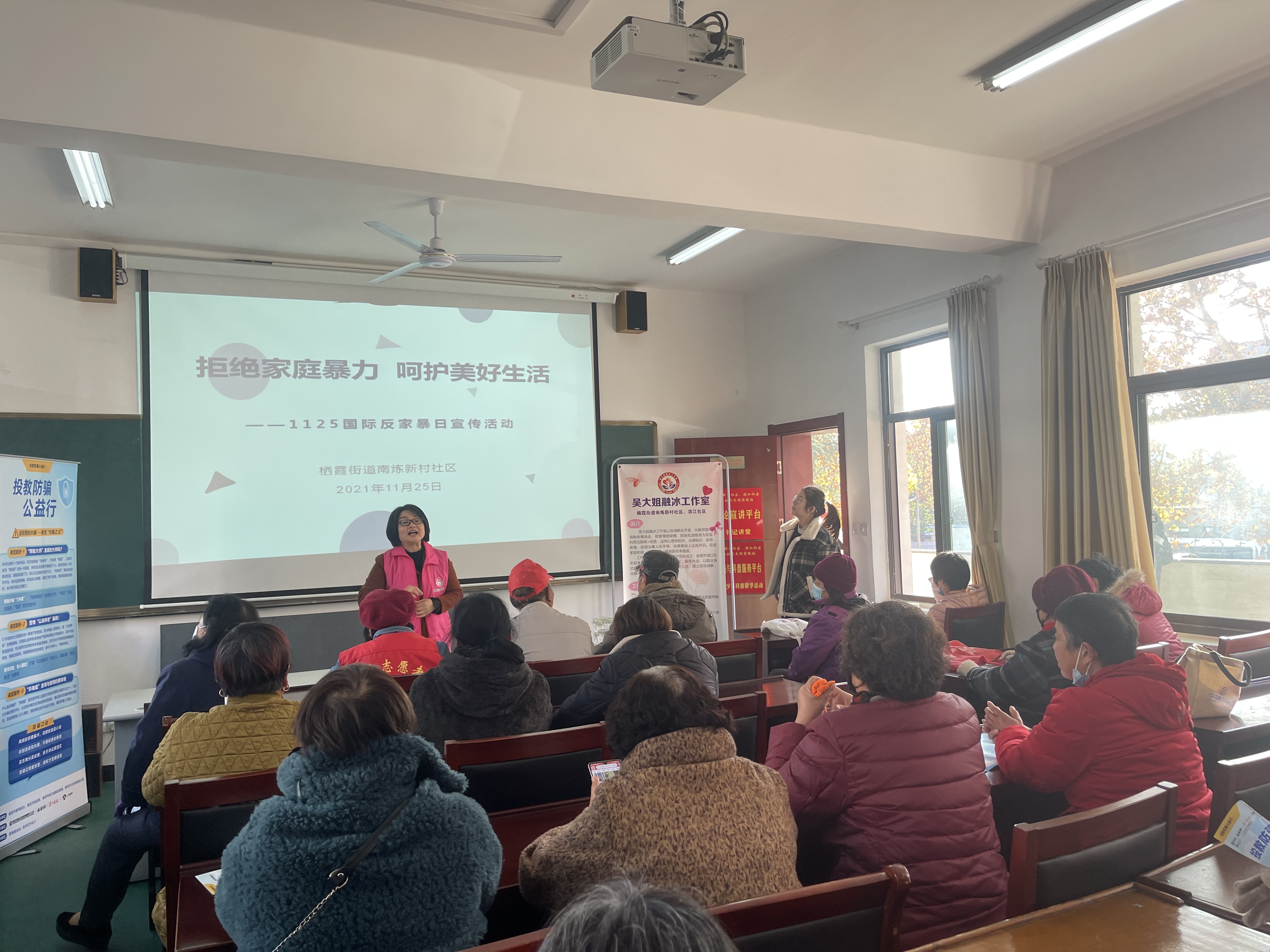 为进一步增强辖区妇女法律意识和维权意识,提高自我保护能力,促进家庭和谐、社会稳定,在11·25国际反家庭暴力日来临之际,南炼新村社区居民学校联合社区“吴大姐融冰工作室”为居民开展了一场反家暴宣传讲座活动,推进家庭暴力预防和宣传工作的深入开展。