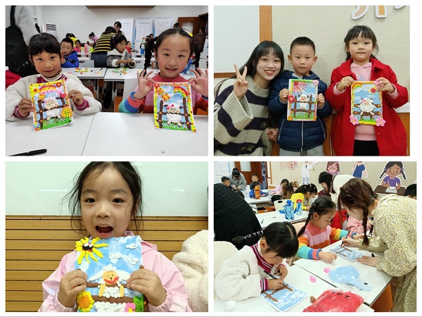 11月27日是齐民路社区内开展的第一次创意美术课程活动,家长和小朋友们都十分热情踊跃。活动主题是小羊粘土画,志愿者们提前准备好卡纸和各种颜色的粘土材料,并辅助小朋友们将卡纸裁剪两半,画上方框。小朋友们在志愿者们的引导下,铺上蓝色天空、贴上一个个小圆球作为小羊,并加入了自己的独特创意,完成了一幅幅有创意的小羊粘土画。
