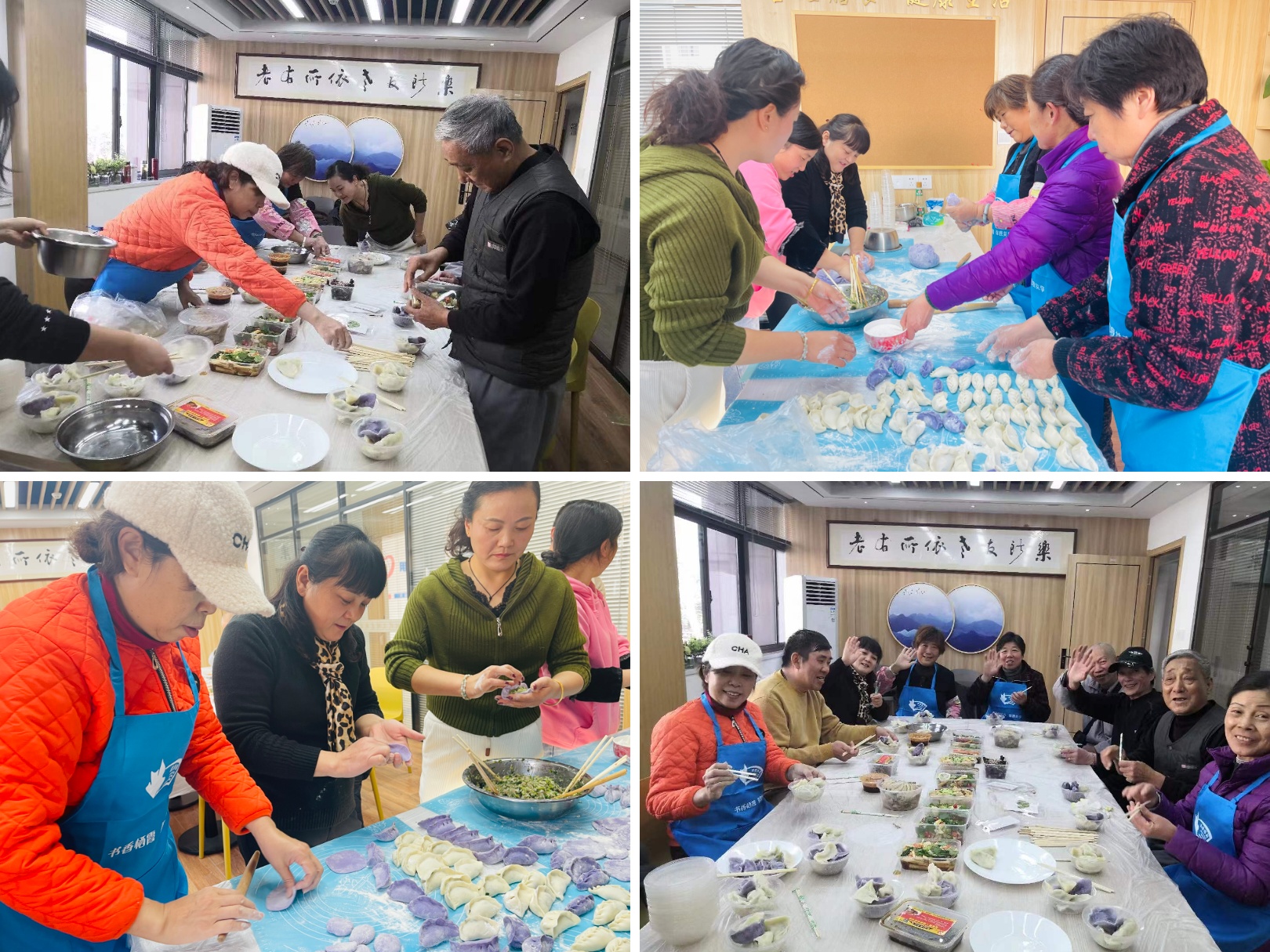 正值冬至,一大早工作人员就和志愿者到菜场买好了荠菜、芹菜和肉,做了两种馅心。活动伊始,大家分工合作,择菜、洗菜、切菜、揉面、擀皮、包馅,现场其乐融融,氛围温馨。在一片欢声笑语中,一盘盘热气腾腾的饺子被端上了桌。大家围桌而坐,社区大家庭团圆饺子宴热闹开席。品饺子,拉家常,活动融洽了邻里关系,增强了老人们的归属感。