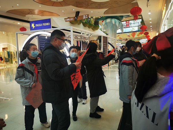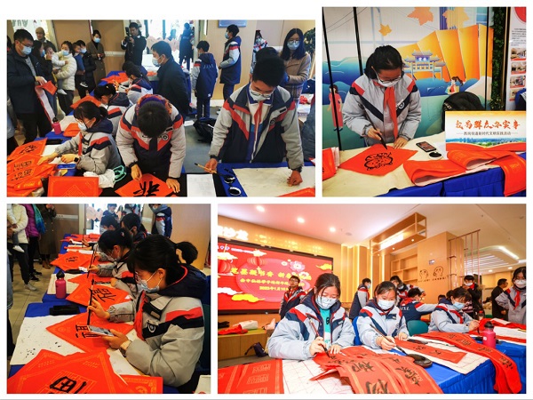 2022年春节前夕,广志路新时代文明实践站联合万达茂商管、金陵中学在茂茂里党群服务中心开展迎春送福写春联活动。活动现场金中学子挥毫泼墨:隶书的有折无转、楷书的齐而不拘、草书的笔画连绵、行书的悠游流转,在汉字的线条美与结构美之中传递了浓郁的新春祝福。活动最后,将百余幅春联、福字赠送给现场居民,营造了浓厚的传统文化氛围。