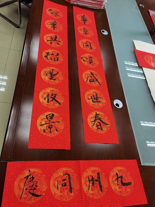 活动当天,社区特别邀请了社区书法家来给居民们写春联,书法家泼墨挥毫,一行行俊逸的书法,一句句祝福的言语,比那些印刷的对联更有年味。不一会儿功夫,几十幅新春对联就完成啦,有祝福联、喜联,还有言志联。因为疫情原因,没有邀请居民前来参加活动,而是由工作人员和志愿者们带着春联和福字,上门送温暖,拿到春联的居民各个脸上洋溢着笑容,纷纷向社区和志愿者们表示谢意和赞美。
