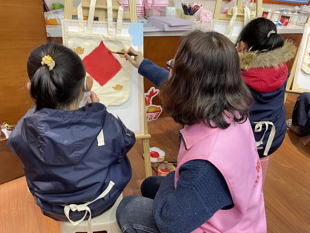 活动前,手绘老师绘制了3种样式的“福”包图案给大家参考,介绍了绘画顺序和注意事项。志愿者们分发工具后,大家戴上围裙,拿起画笔开始创作。小朋友在社区妇联志愿者的帮助下认真作画,共同写下大大的“福”字。