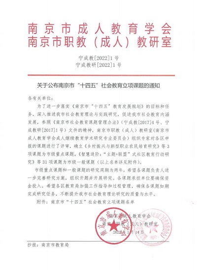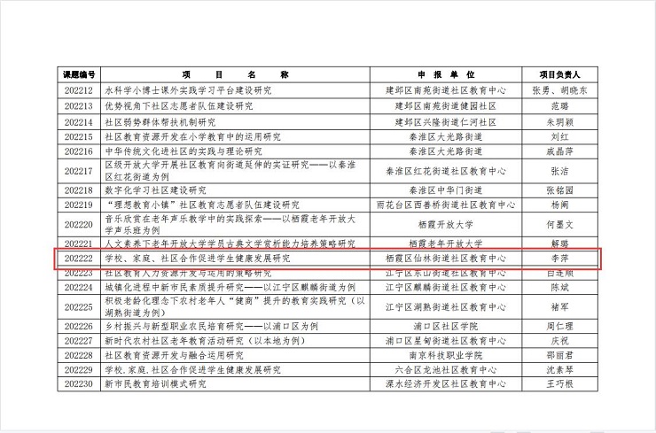 教育要发展,科研必先行。仙林街道社区教育中心一直按照“育人为本,科研兴教”的思路,加强课题研究,倡导“实质科研”。在前期承担的《网格化社区教育模式促进和谐社区建设的实践研究——以仙林街道为例》的“十三五”课题成功结题后,又成功申报了南京市“十四五”社会教育课题《学校、家庭、社区合作促进学生健康发展研究》。