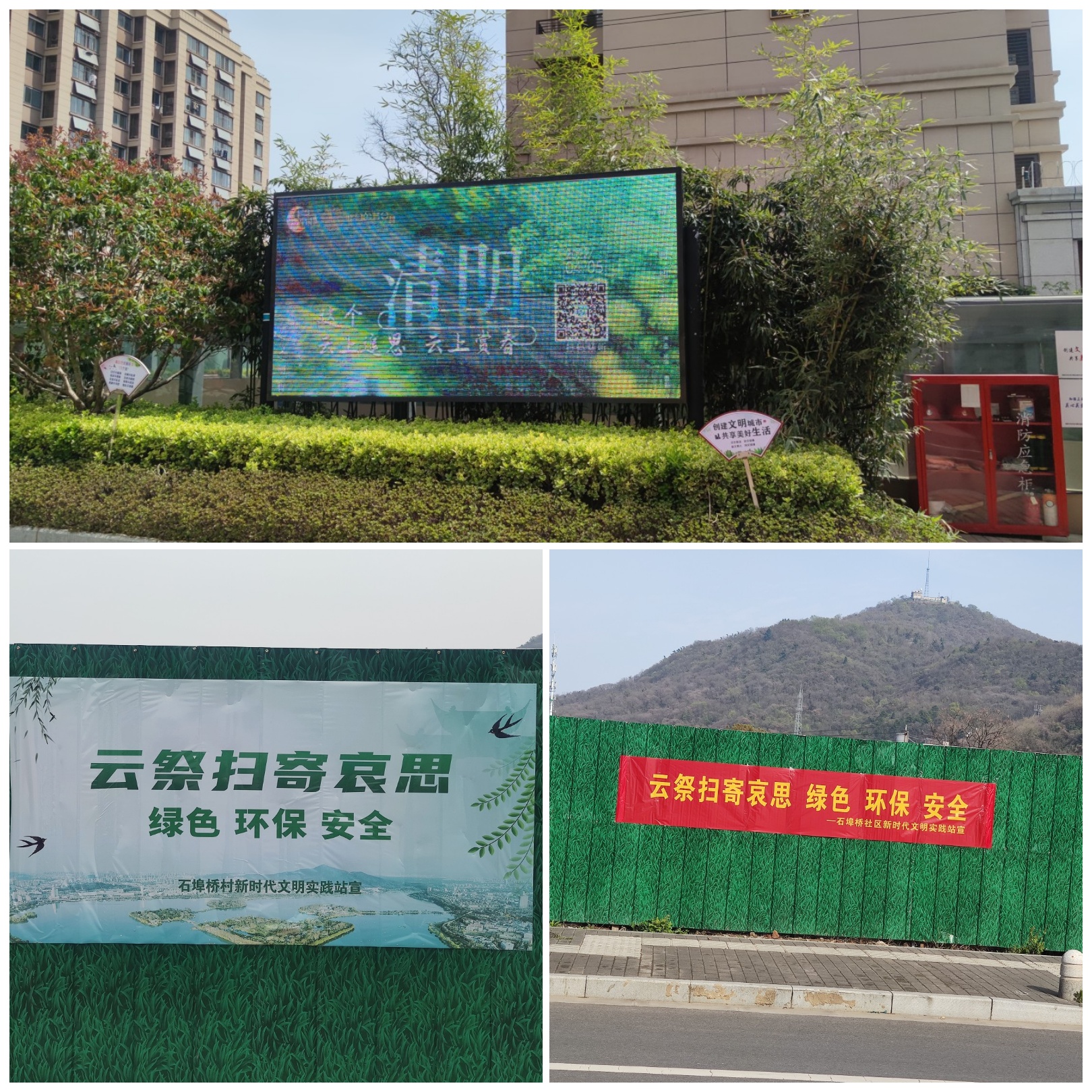 加大宣传绿色安全云祭扫石埠桥村新时代文明实践站从3月底至4月广泛开展云祭扫、森林防火等内容的宣传活动。通过小区户外电屏、楼栋出入口电子屏、通过微信掌上云社区、道路横幅等多种形式居民宣传云扫祭,提醒广大群众绿色、环保、安全、外出踏青谨慎用火,文明祭祖,严防火灾事故发生、从法律的角度宣传《森林法》、《消防法》等相关法律知识,做到文明祭祖,杜绝森林火灾发生。