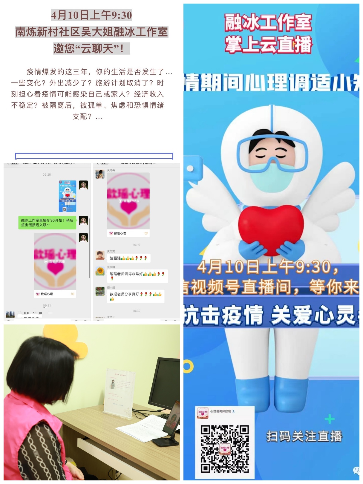 “社区群里就能参与这种心理疏导,既方便又贴心,希望下次还能和歆瑶老师在线聊天。”直播结束,大家仍依依不舍。据了解,前期南炼新村社区“吴大姐融冰工作室”通过掌上云社区开展在线协商,征集需求,结合疫情期间的实际情况,将线下心理疏导转为线上直播,并投放至6个社区群中。社区通过汇聚社会组织的专业力量,服务更多受疫情影响的普通人,把关心关爱汇聚到一起,共同筑牢防疫“心防线”。