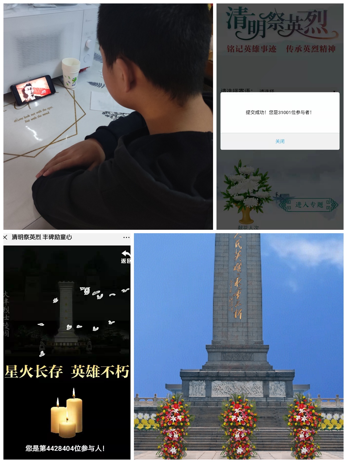 此次“云祭扫”活动是社区教育工作志愿者通过手机微信群,短信,电话等方式号召辖区青少年报名参与。活动呼吁广大青少年继承先烈遗志,为祖国的繁荣富强努力学习。