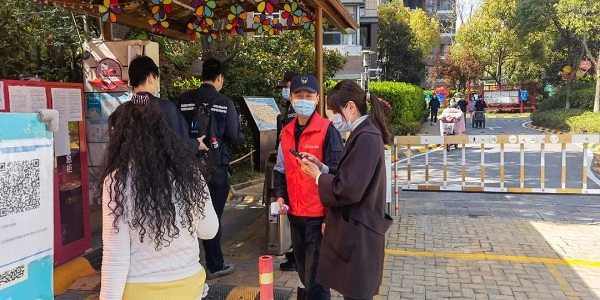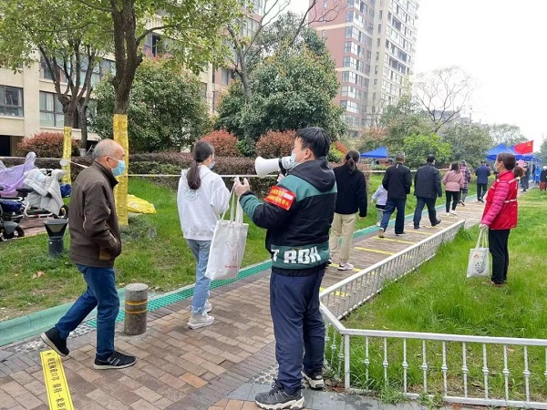 “红马甲们”用流动小喇叭反复播报:“所有进出人员请戴口罩、测体温、扫场所码、验双码(苏康码+行程码)!主动完成进小区查验!”。对于无法“扫码通行”的老人、儿童等人员,严格落实人工方式登记。
