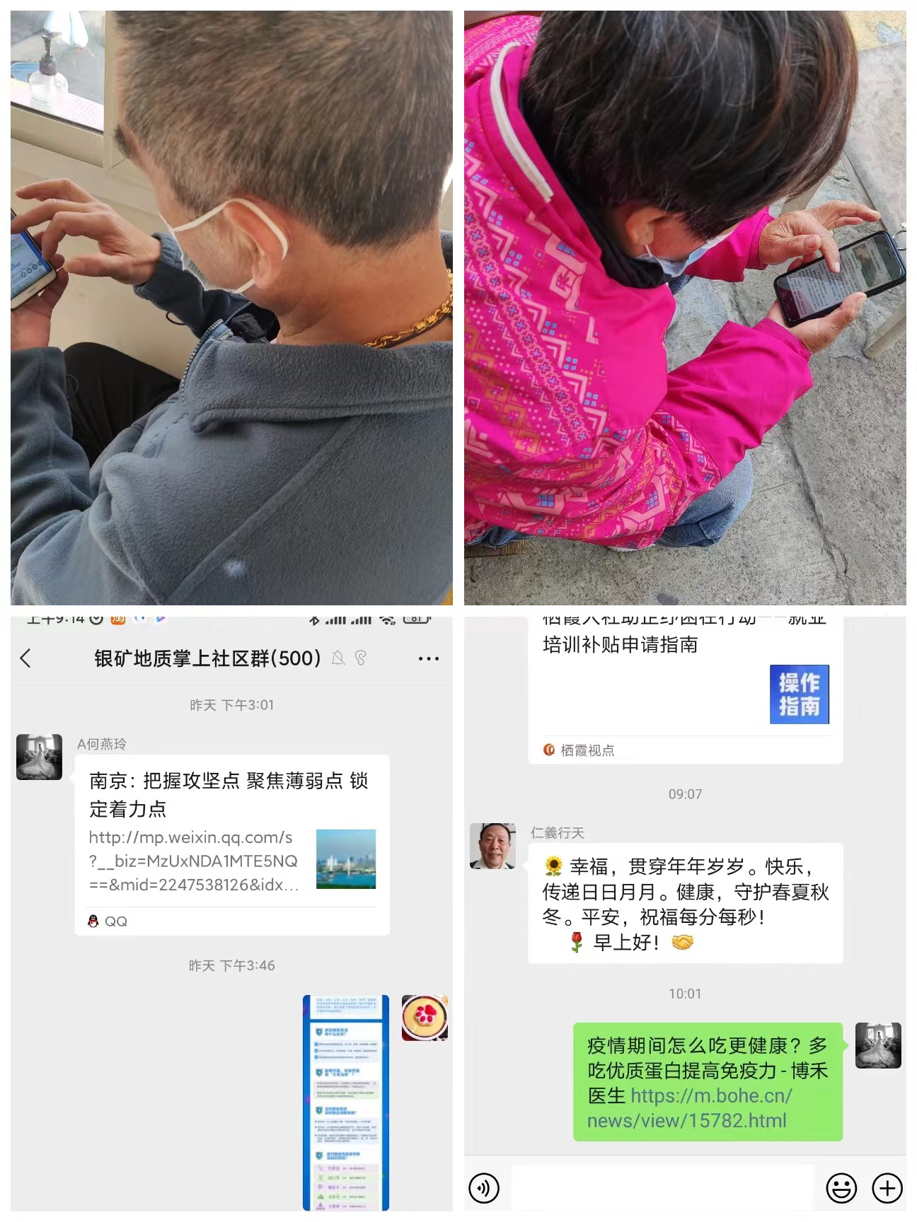 在银矿地质社区“掌上云社区”群里,居民通过阅读推送的信息报道,了解防疫知识和防疫政策。同时,志愿者还通过短信和微信向居民宣传健康饮食知识,告诉居民如何提高对病毒的抵抗能力。这次活动也让大家明确,只有工作人员不断学习防疫知识、食品安全知识,才能更好地为居民服务。在线上学习过程中,社区志愿者还向居民倡议在日常居家中做到:打疫苗,戴口罩,勤洗手,多通风,少聚集,不隐瞒,少出行,莫恐慌,多锻炼。
