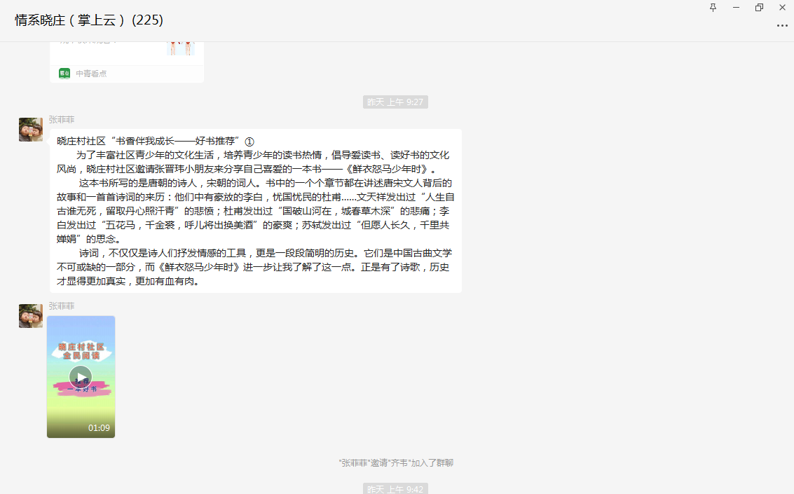 为了丰富社区青少年的文化生活,培养青少年的读书热情,倡导爱读书、读好书的文化风尚,结合疫情的原因,近日,晓庄村社区在线上开展了“‘书香伴我成长——好书推荐’”活动,邀请张晋玮小朋友来分享自己喜爱的一本书——《鲜衣怒马少年时》。