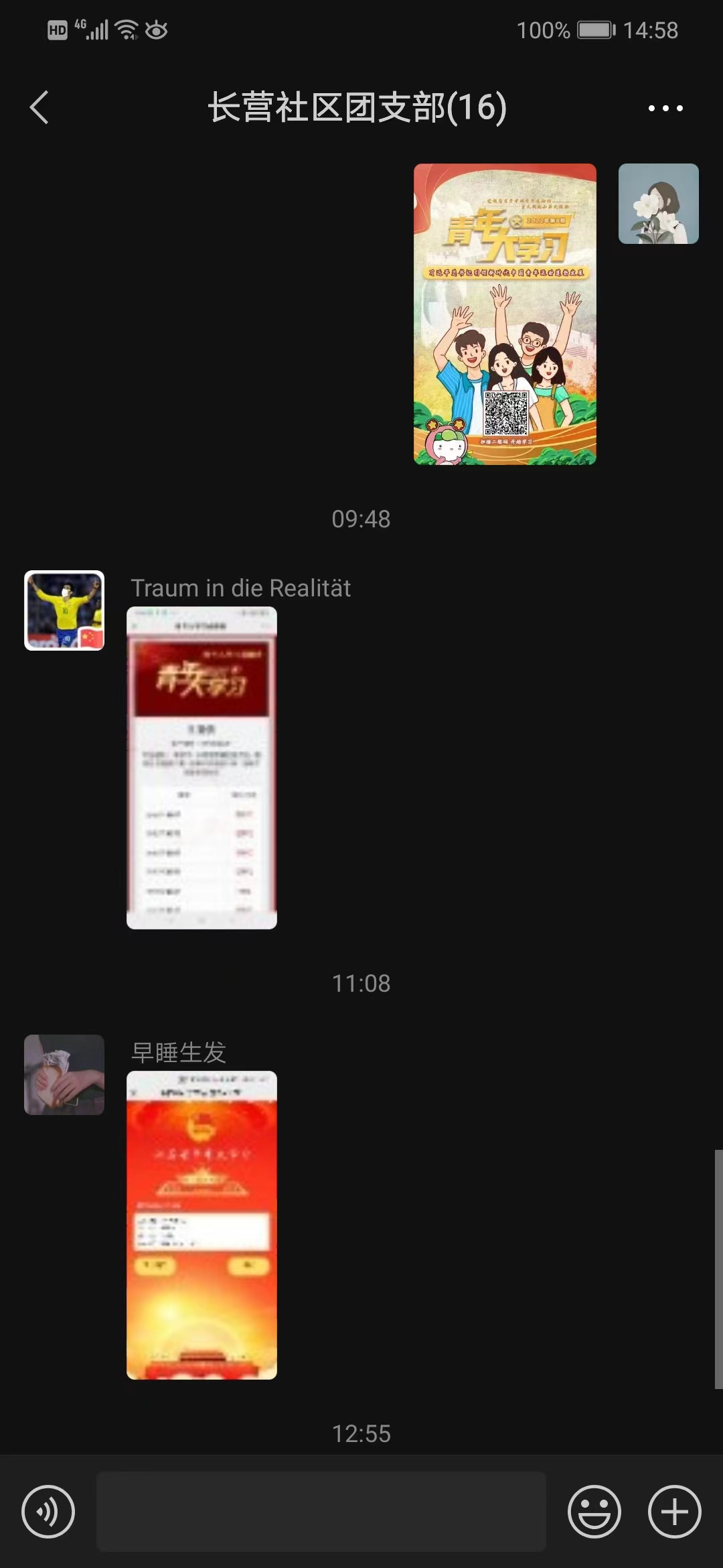 因疫情防控要求,本次阅读活动采用线上活动的方式,社区工作人员引导辖区青年关注”栖霞青年”微信公众号、下载学习强国APP,并在微信群中发布学习链接,指导青年使用手机进行学习。本次阅读学习内容为“习近平总书记引领新时代中国青年运动蓬勃发展”,党的十八大以来,习近平总书记高度重视新时代共青团建设,强调“团的所有工作,归结到一点,就是要当好党的助手和后备军”,把青年工作上升为党治国理政的一项基础性、全局性、战略性工作。习近平总书记深刻指出“青年工作,抓住的是当下,传承的是根脉,面向的是未来,攸关党和国家前途命运”。青年们在线上观看学习视频、阅读学习内容,在微信群中分享自己的打卡图片、交流学习感想和心得体会,同时还转发朋友圈向辖区居民开展全民阅读,让大家更全面、更系统、更准确地了解党的历史进程、最新的方针政策,让阅读学习入脑走心,不断筑牢理想信念。最后,社区希望青年们每月都能积极主动地参与到阅读学习中来,将学习切实落实到行动上。