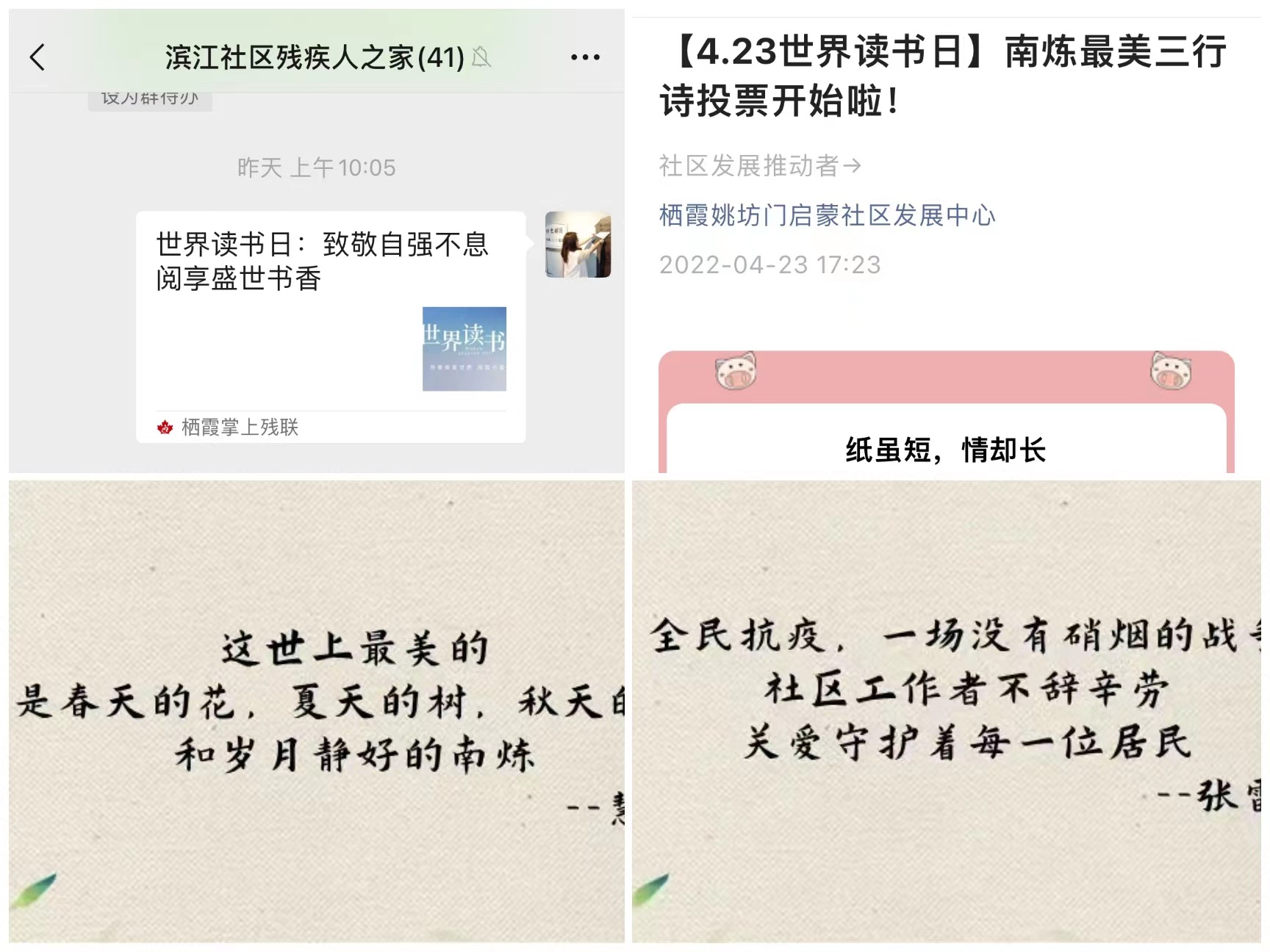 最美人间四月天,全民阅读好时节。4月23日,滨江社区残协组织社区残疾人积极参加由栖霞街道全民阅读办、栖霞街道社工站、栖霞区启蒙社区发展服务中心举办的“南炼最美三行诗”征集活动,残疾人朋友通过掌上云社区平台踊跃投稿,反响热烈。