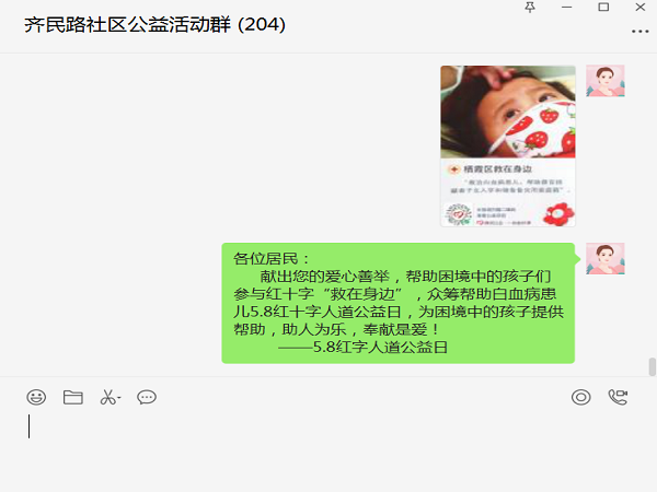 今年“5.8”世界红十字日,因为疫情的关系,齐民路社区通过线上开展了5.8宣传活动。齐民路社区公益群是一个家长群,热心公益的家长经常参加社区的活动自发组建了一个微信联络群,方便接收最新的活动消息。社区在公益群内发出号召,让家长们献出爱心善举,帮助困境中的孩子们参与红十字“救在身边”,众筹帮助白血病患儿,为困境中的孩子提供帮助。同时通过社区电子屏播放宣传海报,进一步弘扬“人道、博爱、奉献”的红十字精神,增进公民公益意识,使广大市民投入到奉献的行列中来,使红十字精神发扬光大。