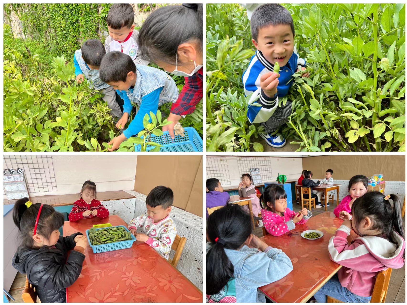 经过一个多小时的劳动,几十斤豆荚全部被摘下。孩子们在老师的指导下,还一同探究蚕豆的结构,同时享受美味。
