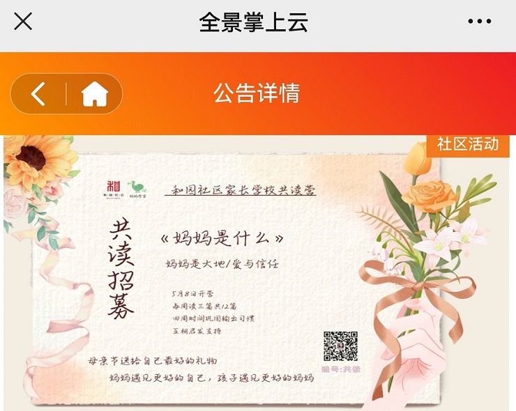活动中,志愿者带领大家一起共读《妈妈是什么》——“妈妈是大地”篇章的其中12篇。每周共读三篇,并在线上微信群分享读后心得。