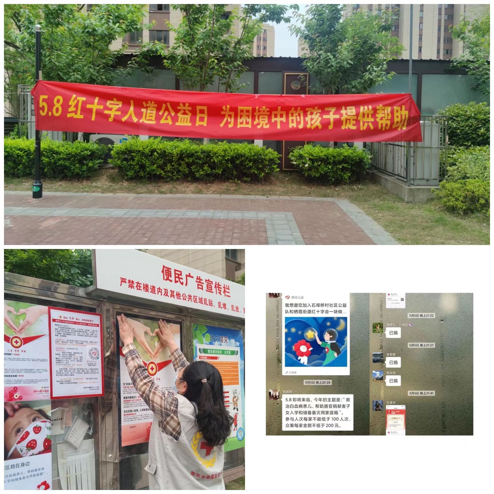 石埠桥社区居民学习、新时代文明实践站、红十字会志愿者通过微信群、朋友圈等方式简便、快速转发项目的二维码,广泛发动身边的爱心人士踊跃参与。在“5.8人道公益日”期间,通过电子大屏、宣传橱窗、广告栏等阵地,积极播放、张贴宣传海报和制作宣传横幅等线下劝募活动,努力营造出浓厚的募捐氛围。