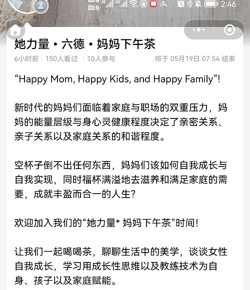 新时代的妈妈们面临着家庭与职场的双重压力,妈妈的能量层级与身心健康程度决定了亲密关系、亲子关系以及家庭关系的和谐程度。活动利用下午茶时间,带领妈妈们一起聊生活中的美学,谈女性自我成长,学习用成长性思维以及教练技术为自身、孩子以及家庭赋能。