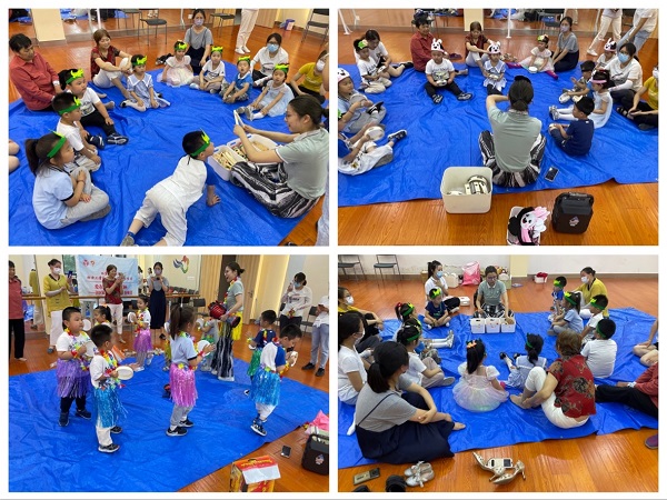 活动开始,老师带领小朋友们进行绘本阅读《独一无二的我》,引导孩子们认识到每个个体都有自己的独特性。接着,老师通过音乐与游戏的结合,带领孩子们学习了乐器非洲鼓,手摇铃,沙盒散响,三角铁等。其中最受孩子欢迎的就是非洲鼓环节,小朋友们在家长的协助下带上花环,穿上草裙,围绕着篝火边唱边跳,整个会场充满了孩子们的欢声笑语。
