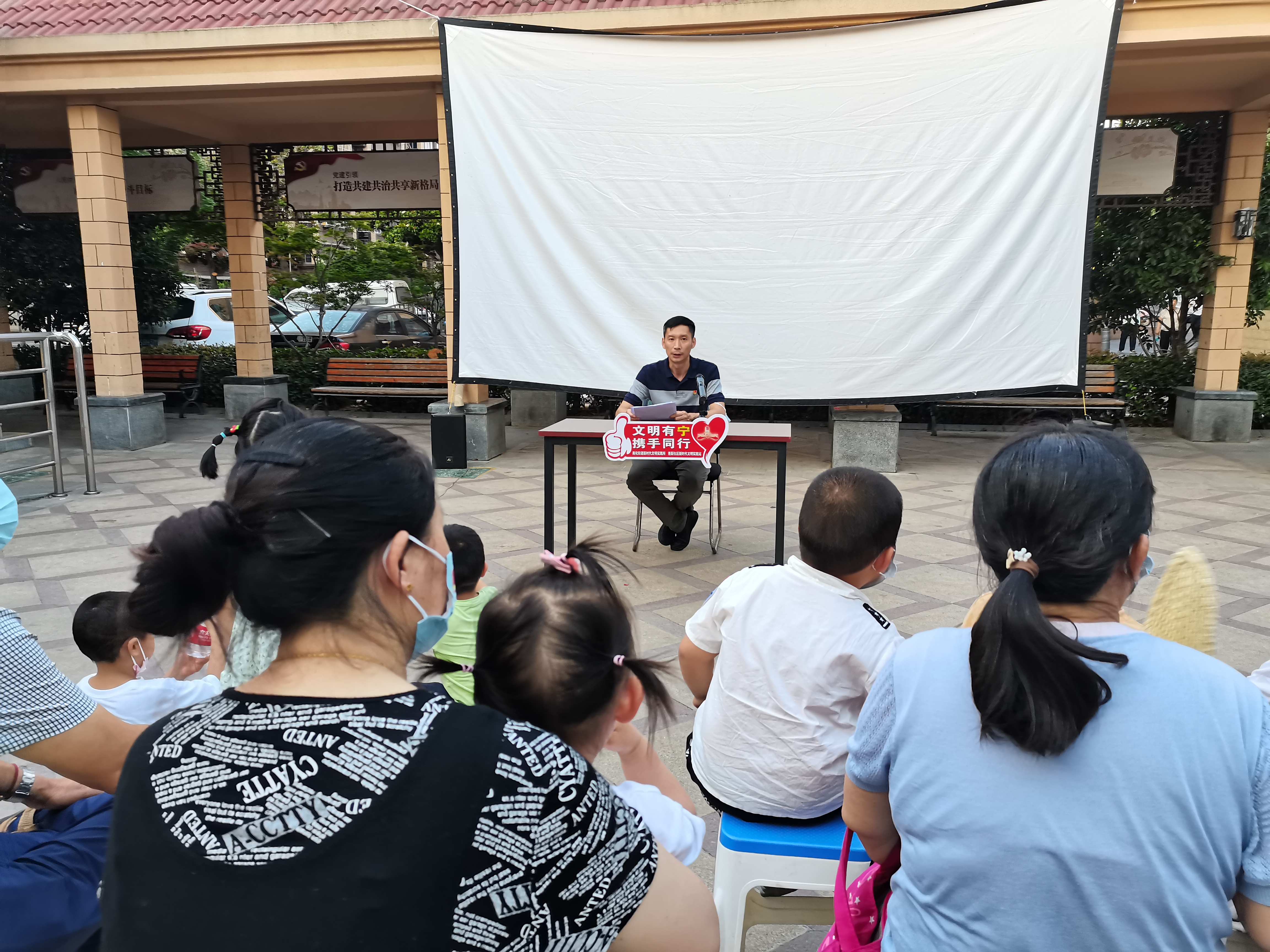 辖区党员、居民带着小朋友,纷纷来到金尧山庄小广场,等待活动开始。电影放映前,社区网格员、新时代文明实践站服务队志愿者为现场居民发放“国安”主题定制口罩,进一步强化居民国家安全意识。随后社区党总支副书记夏春作“文明有‘宁’ 携手同行”为主题的宣讲。夏书记向现场居民更深入地普及“文明典范城市”创建相关知识和内容,进一步了解创建的意义和内涵,并指号召居民从自己做起,从身边做起,规范言行,团结邻里,互助友爱,为创建美好家园贡献自己的点滴力量!