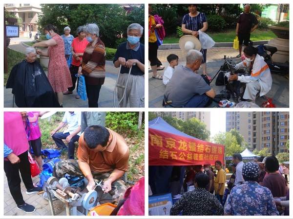 7月1日一大早,工作人员陆续来到晶都名苑小区中心广场,大家各司其职,摆放桌椅板凳、搭遮阳棚、挂横幅。医疗队成员布置各种检查仪器,便民服务工作人员摆好自己的维修工具,大学生志愿者准备手工制作的材料,社区工作人员准备入户赠送爱心联系卡,大家井然有序,做着活动前的准备工作。
