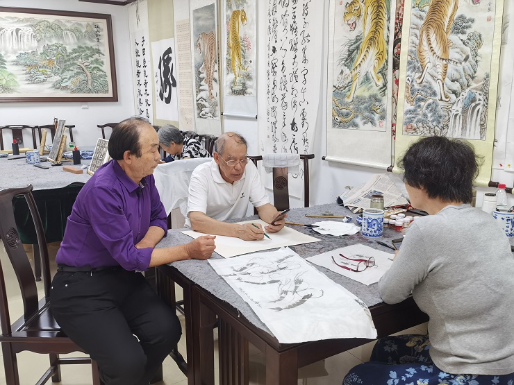 老年书画爱好者相聚一堂,泼墨挥毫,其乐融融。活动现场,老人们还不时一起交流,相互切磋,相互谈论研究,取长补短,通过交流得到启发,产生创作灵感。大家你一言我一语,共同的爱好拉近了老年人之间的距离,都期待下一次的相聚。