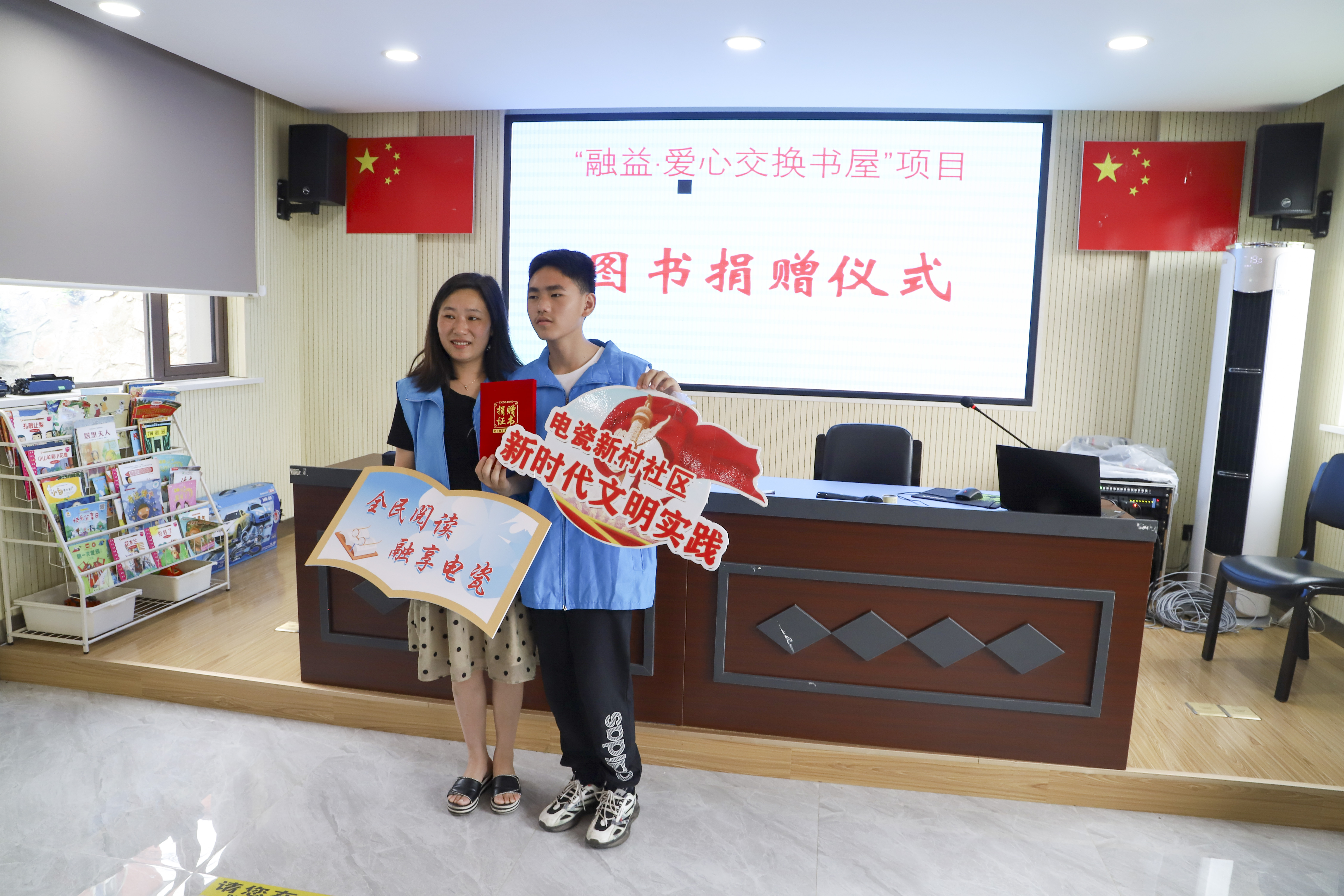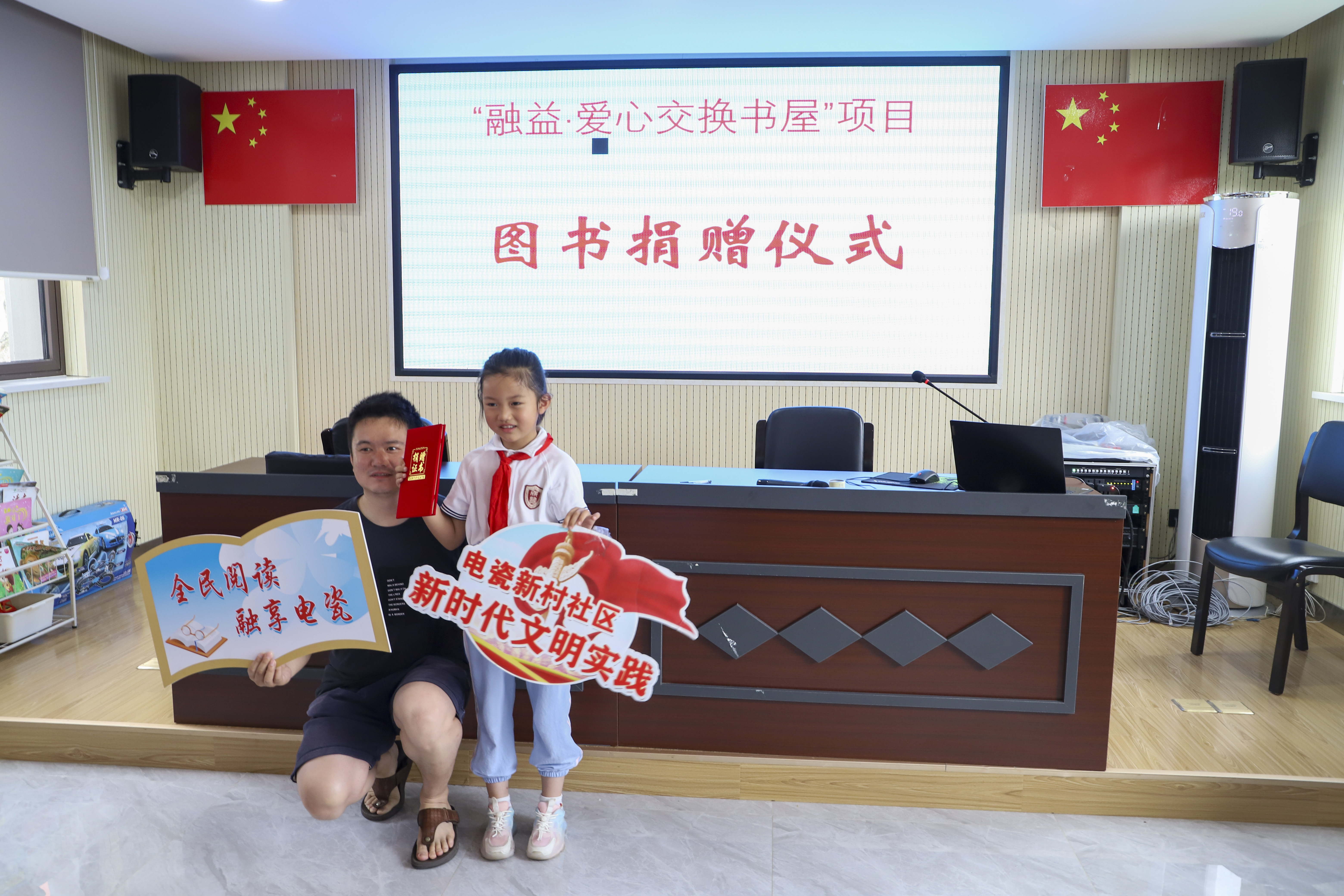 为了培养辖区内孩子们爱读书、会读书的良好习惯,引导他们阅读经典书籍,增进知识的掌握,通过交换和捐赠书籍激发他们的公益爱心,电瓷社区居民学校积极开展以“融益·爱心交换书屋”为主题的捐书仪式亲子活动