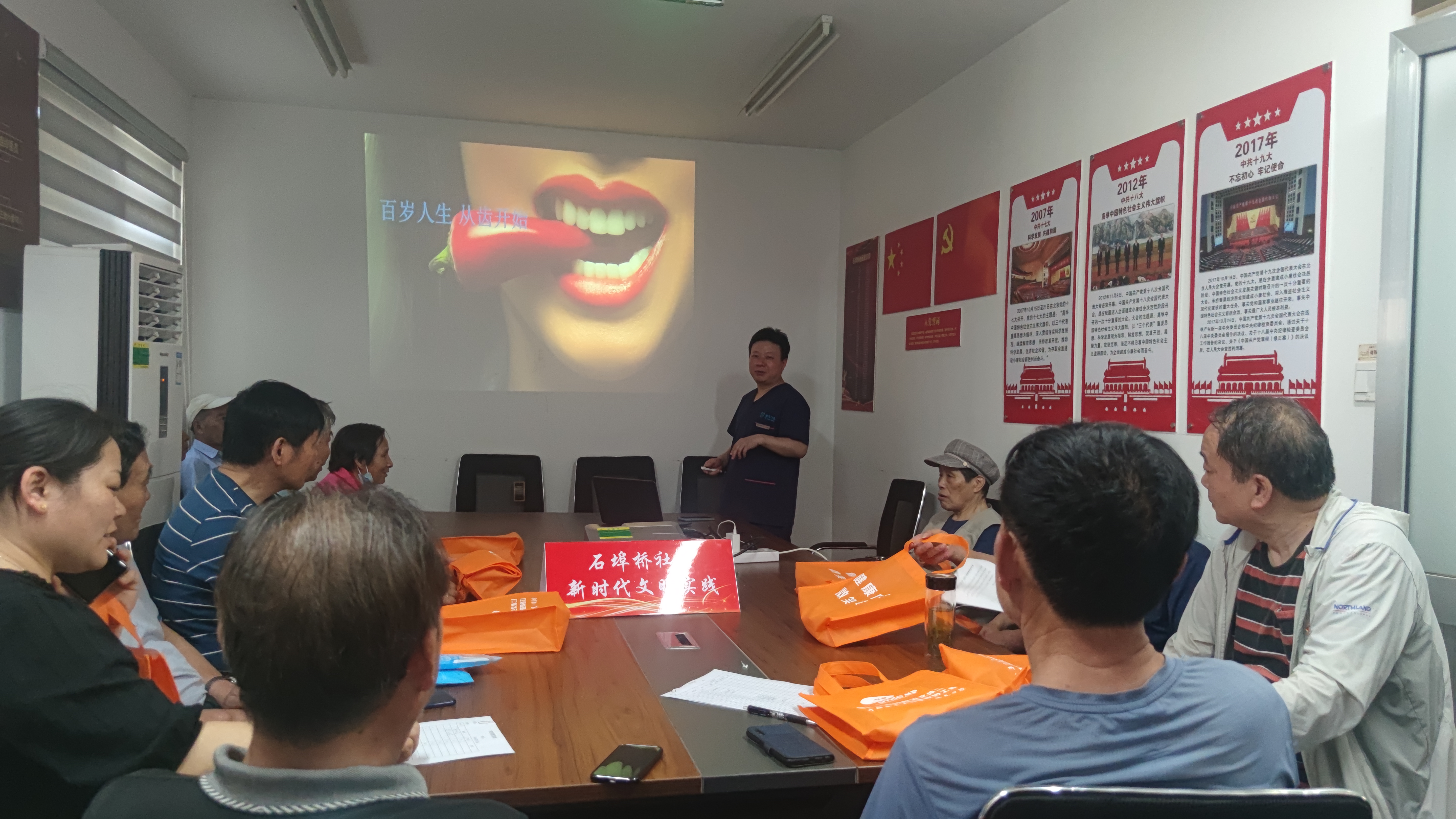 活动讲座以PPT图文形式用真实案例现实说法为参加人员展开一场通俗易懂的牙周疾病专业知识的普及,讲述老年人牙齿松动、牙龈发炎及口腔溃疡等症状的病因,讲解了牙齿保护、口腔疾病预防及治疗方法,宣传口腔保健知识,指导居民养成良好的口腔护理习惯。活动最后,现场工作人员还给大家发放了口腔保健小礼品,大家反响热烈,积极提问,将现场活动的气氛推向了高潮。