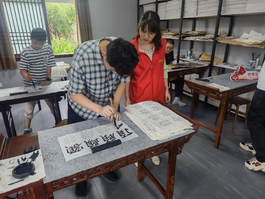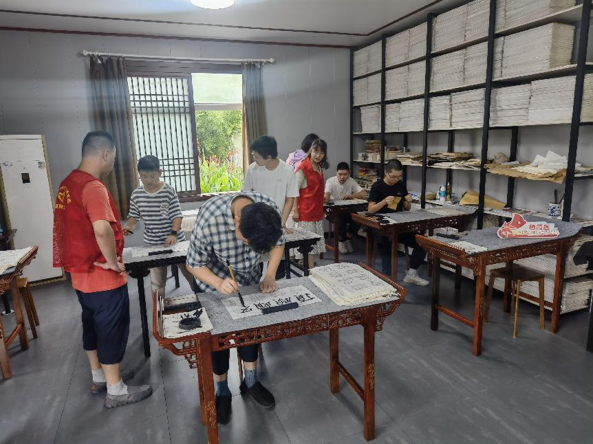 “书法与中华民族精神成一体,有着深厚的文化内涵,是世界艺术之林的瑰宝,它以汉字为载体,涉及语言、文学、历史、美学等方面,又与音乐、美术相通,所以,学习书法就是在直接与中国文化对话……”7月20日,在七里村新时代文明实践站里,新时代文明实践站志愿者正在向孩子们讲述书法的重要价值,帮助未成年人更加深入地了解中华传统文化。