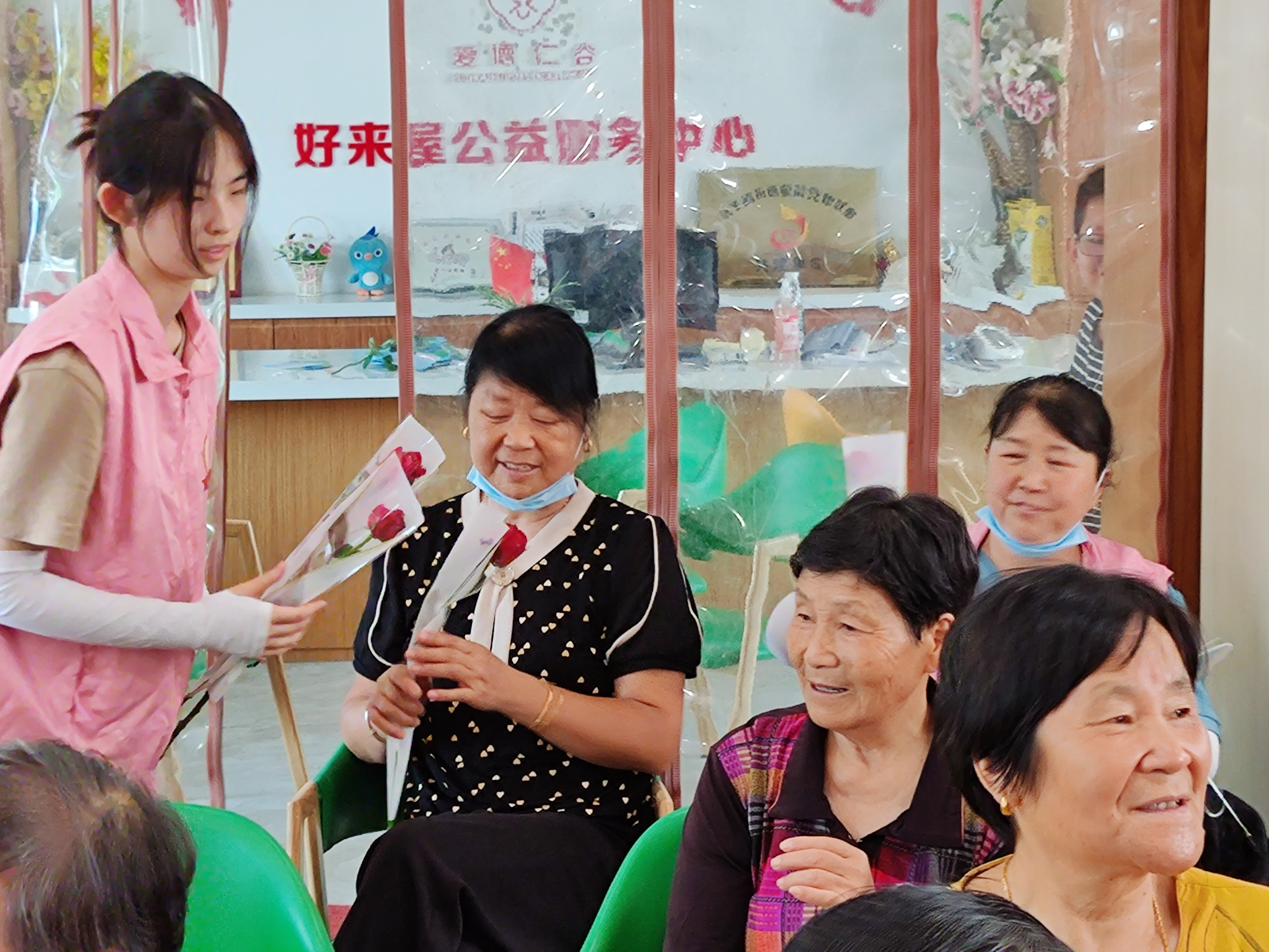 本次活动邀请了以退休老教师、退休老党员为代表的二十多位社区老人来到站点共度美好时光。活动一开始,我们邀请了一对夫妻代表上台诉说他们的爱情故事,故事诉说完,爷爷为奶奶送上了鲜花并拥抱了奶奶,奶奶为爷爷送上了一块蛋糕,孩子们给剩下的每位老人都送上了鲜花和祝福,每一位老年人的脸上都挂着幸福的笑容,每一处都泛着温情与暖意。礼物不重,但背后的情却暗潮涌动,他们相守一生的爱情是我们年轻人榜样,他们在岁月蹉跎后真挚的爱也让我们年轻人感动,最终活动在爷爷奶奶的掌声中结束。