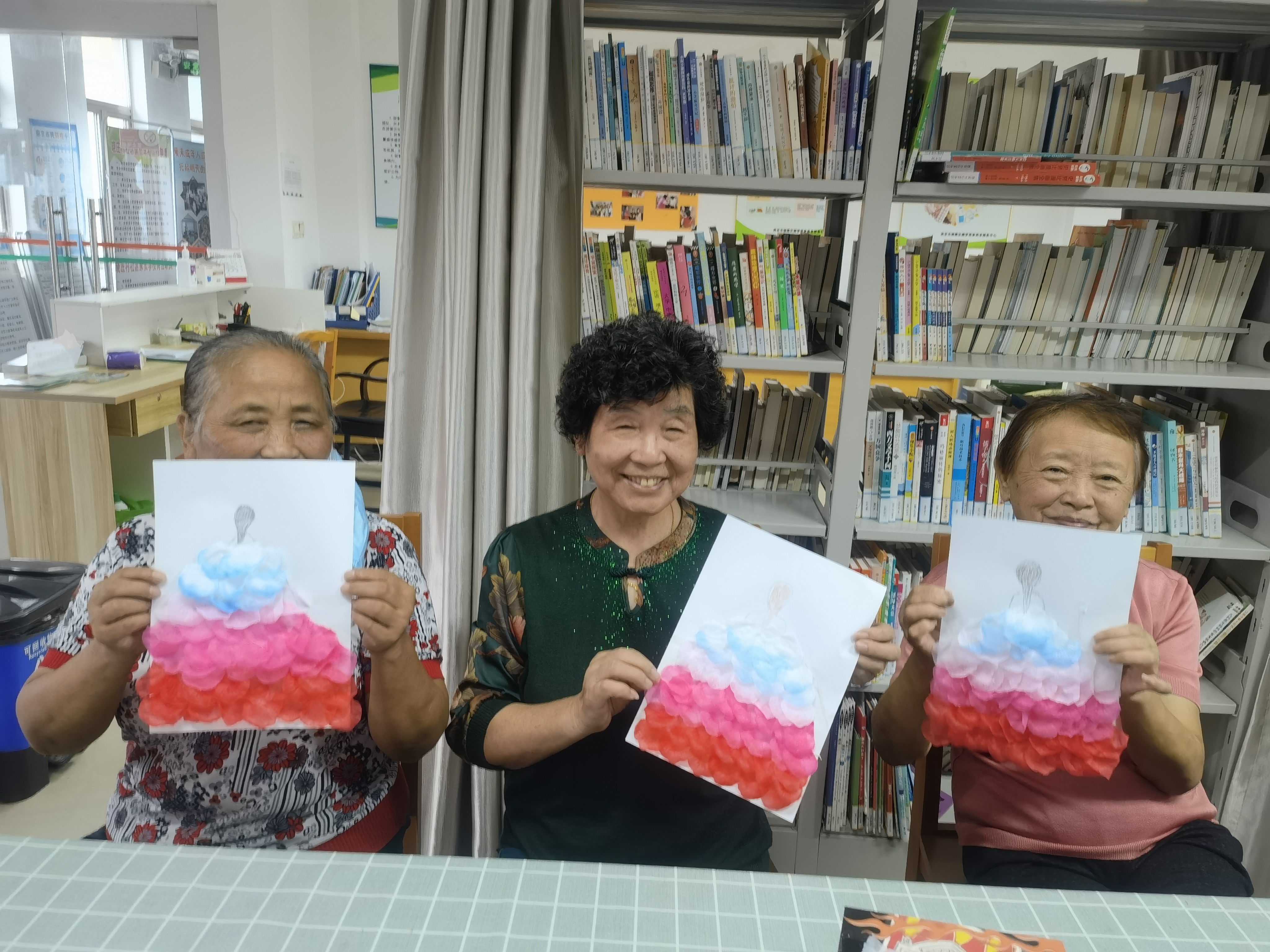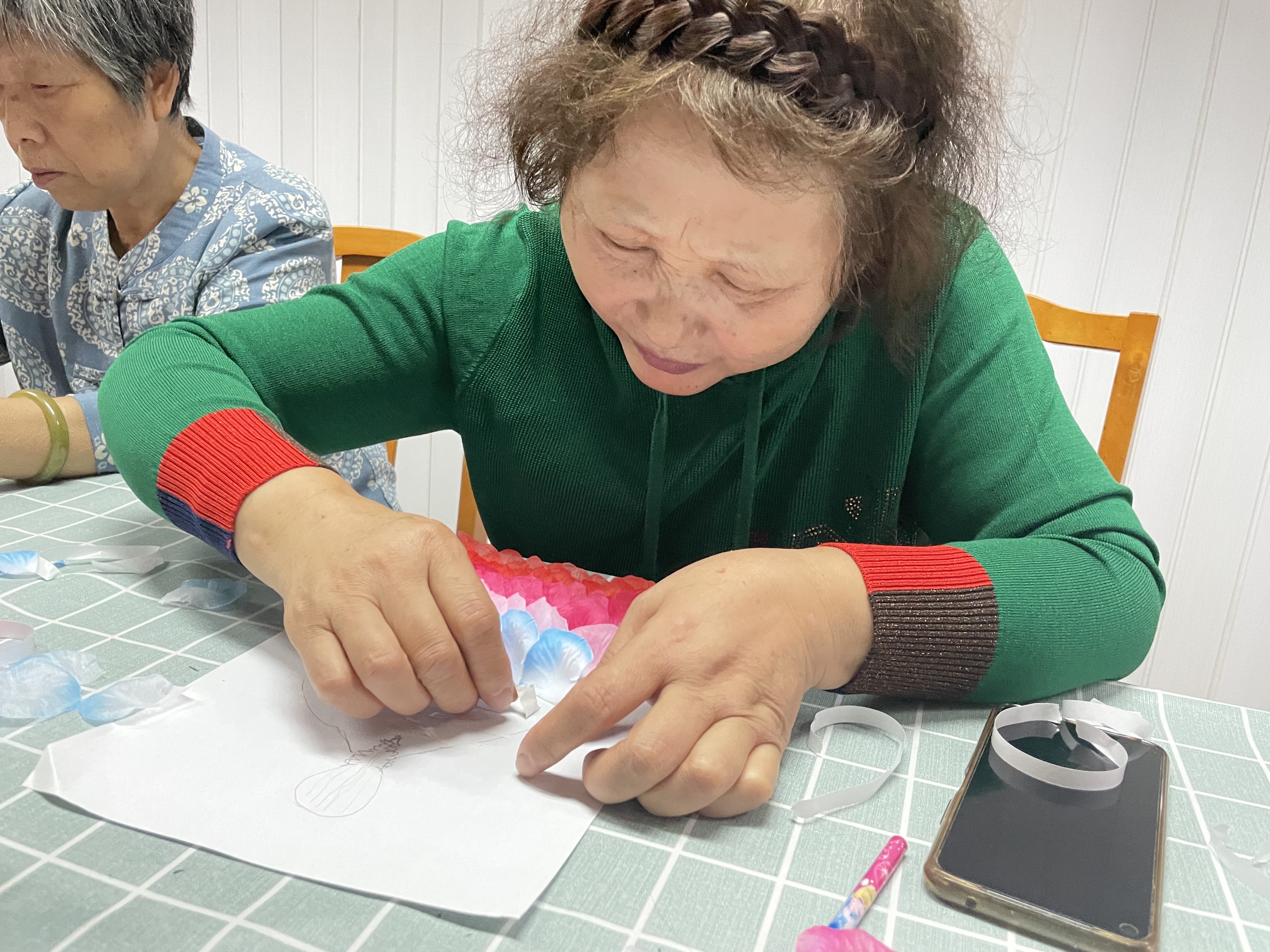 当天,居民们利用花瓣进行创意设计,以“少女的背影”为主题进行粘贴制作。制作过程中,居民们独自思考,发挥着想象力和动手能力,巧妙设计,精心创作,首先拿着彩色笔在A4张上画出背景图,再分步骤操作,从裙摆位置粘上双面胶并按照自己喜好摆放,再到花瓣的分布,进行了有条不紊的制作。不一会儿,大小不一、形态各样的花瓣在居民们的手中变成了一幅幅精美的粘贴画,居民们看着自己的作品心里都乐开了花。
