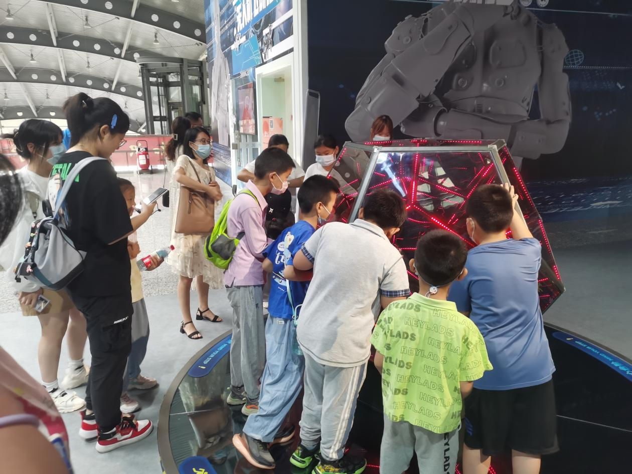 科技馆是学生体验科学、感受科技的最佳场所。走进科技世界,感受科技魅力,同学们都怀着兴奋、好奇、期盼的心情有序进入场馆。一进入展厅,同学们马上就被丰富多样的科技展品所吸引,迫不及待地投入到观察和探索之中。走进声光体验、电磁探秘、运动旋律、数学魅力、健康生活、消防安全等展区,工作人员耐心讲解“生活科技”“物理科技”“天文地理”“益智体验”“数字科技”等这些新奇的展具,赢得了同学们阵阵惊叹,同学们的学习兴趣高涨,在各个展品前参观和体验。