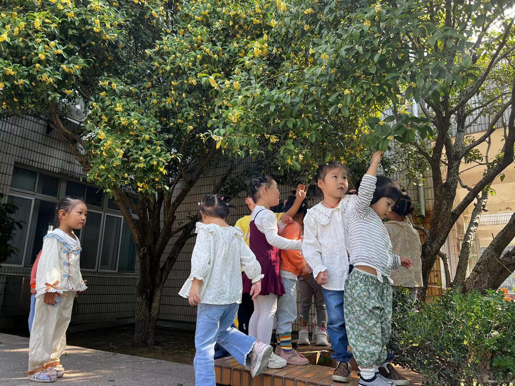 首先,老师通过播放图片,带领少儿认识桂花。接着,大家循着花香,一同在园内寻找桂花树。