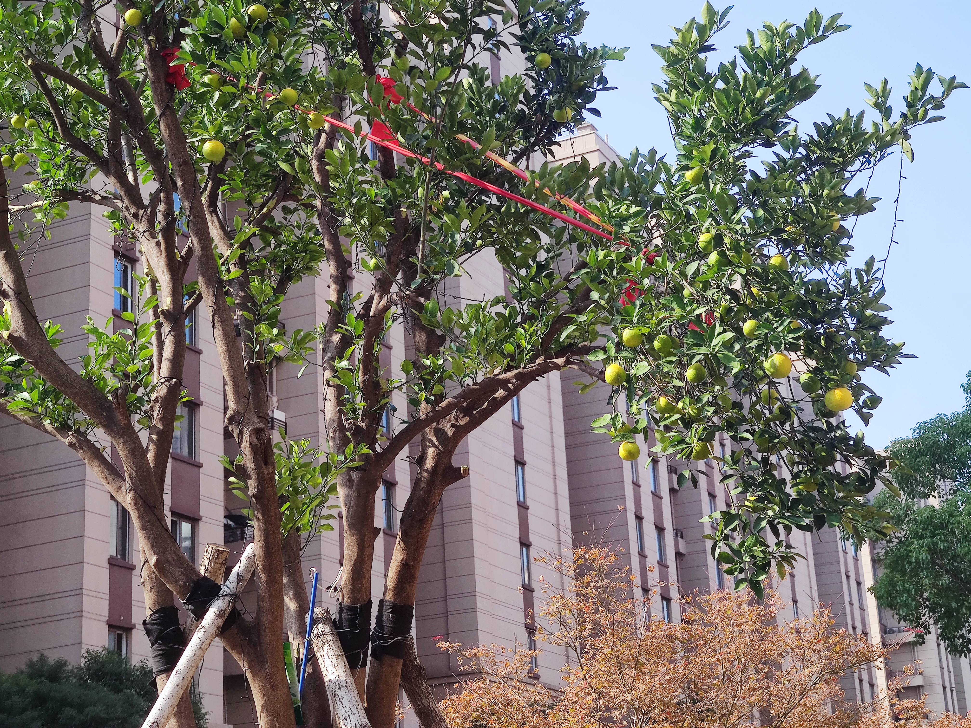 金秋十月,丹桂飘香,正是橙黄橘绿时,石埠湾小区云霞居大门口的橘子树成熟了。进入云霞居北门,映入人们眼帘的大桔树,源于栖霞街道庞家圩拆迁户人家,经石埠湾物业工作人员先后七八次至拆迁记人家,讲述移树是保护树木,前人栽树,后人乘凉。大桔树移入云霞居3幢路口处,在石埠湾物业人员的精心护养下,桔树的橘子树成熟了,黄澄澄的橘子挂在枝头。
