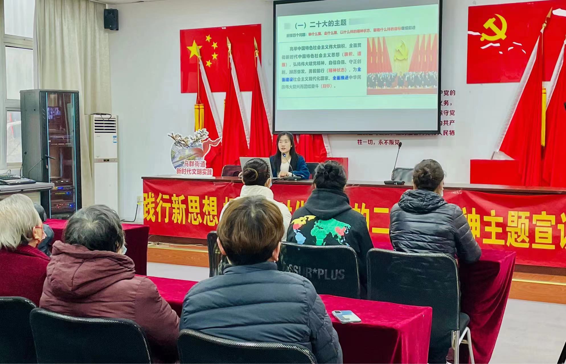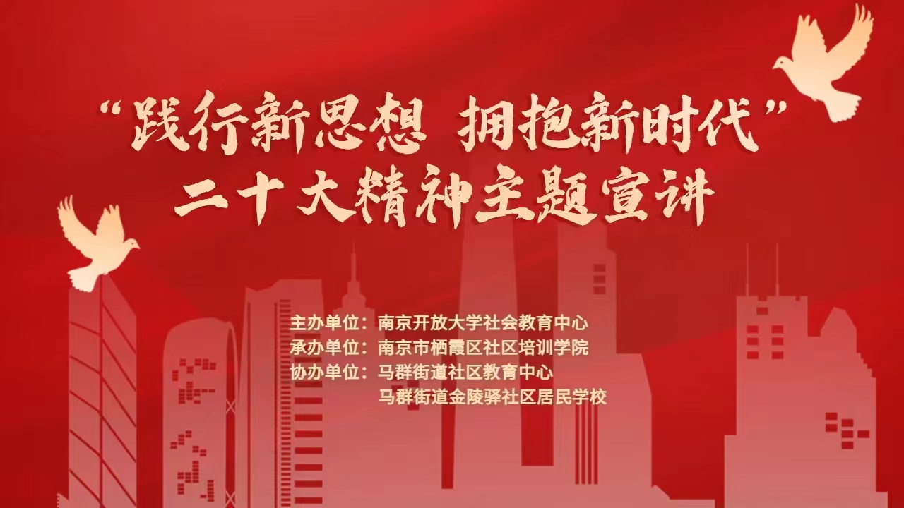 为进一步宣扬中国共产党第二十次全国代表大会精神,营造贯彻落实党的二十大精神的浓厚氛围,12月9日,由南京开放大学社会教育中心主办、南京市栖霞区社区培训学院承办的“践行新思想 拥抱新时代”二十大主题宣讲活动走进栖霞区马群街道金陵驿社区居民学校,居民学校成员通过线上线下方式一同参与学习。