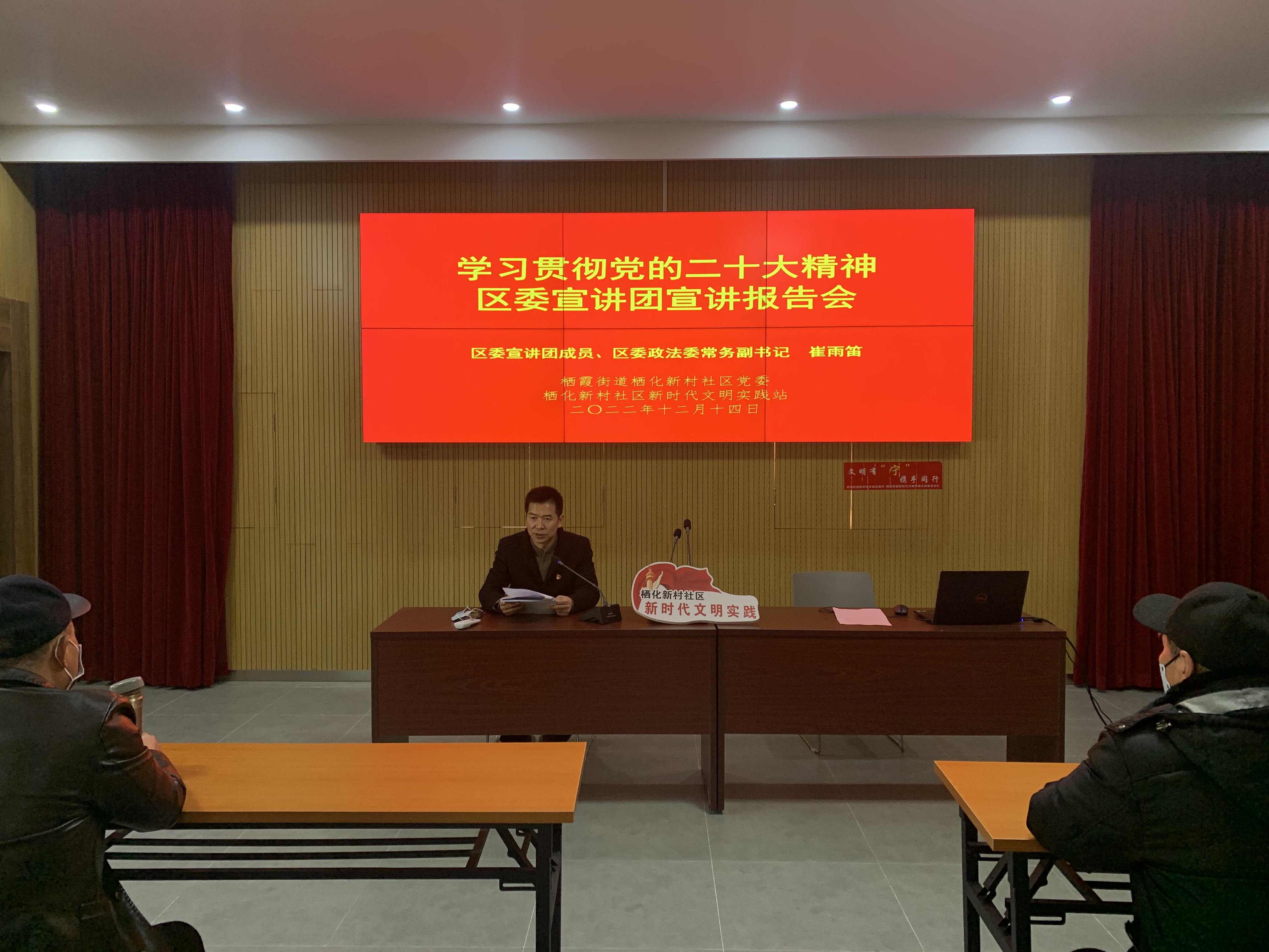 为深入学习贯彻党的二十大精神,切实用会议精神统一思想、凝聚共识、坚定信心。12月14日,栖化新村社区居民学校联合社区新时代文明实践站开展“强国复兴有我”群众性主题宣传教育活动,邀请区委宣讲团成员、区委政法委常务副书记崔雨笛进行专题宣讲。