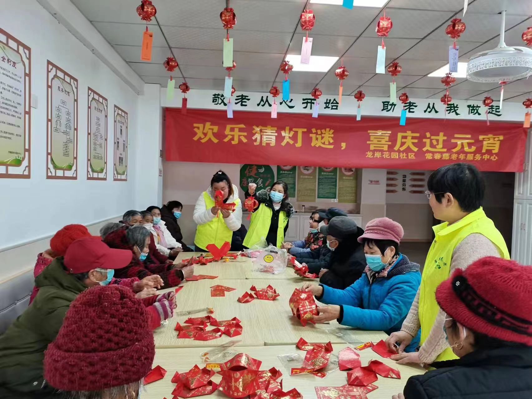 在社区老年服务中心的天花板上,一张张五颜六色的密语纸条迎风飘扬,内容广泛,有字谜、成语、生活用品等,既有通俗易懂的趣味猜题,也有较为复杂的抽象谜题,娱乐性、知识性皆具,居民们纷纷在各个灯谜下热情地讨论着,极大地丰富了居民的精神文化生活。