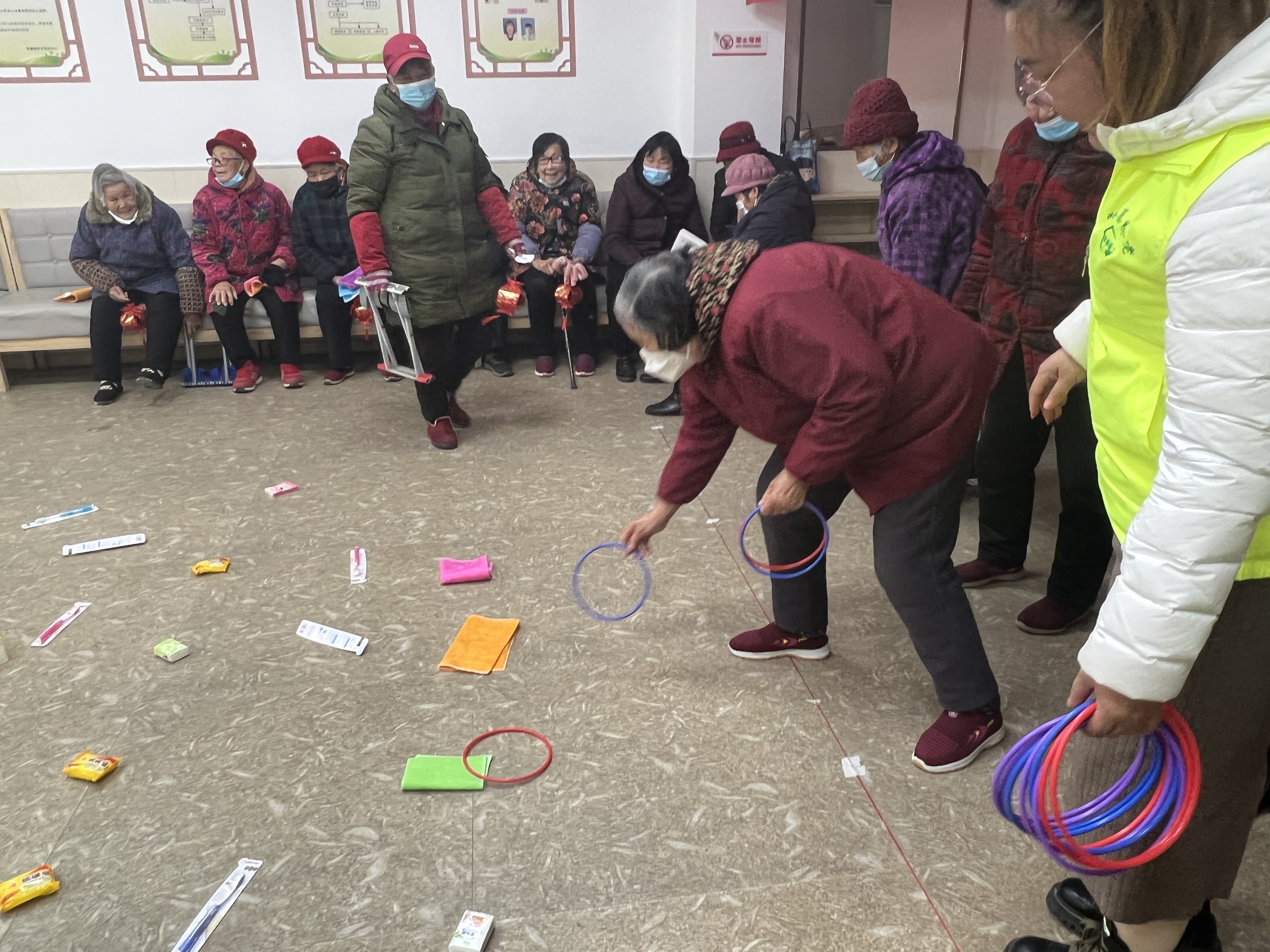 同时,为提高群众参与热情,在猜灯谜的现场还组织了趣味套圈活动,活动开始前,居民们对摆满一地的牙刷、饼干、餐巾纸等生活用品兴趣满满,在志愿者的引导下大家依次排队,每人有五次套圈机会,同时规定套中即得。随着志愿者喊开始,选手们依次排队套圈,只见套圈像风一样飞快地抛出,在欢呼声中,有的第一圈套中,有的第二圈套中,有的圈圈套中,也有的与物品擦肩而过,活动现场大家个个热情高涨,充满了欢声笑语。