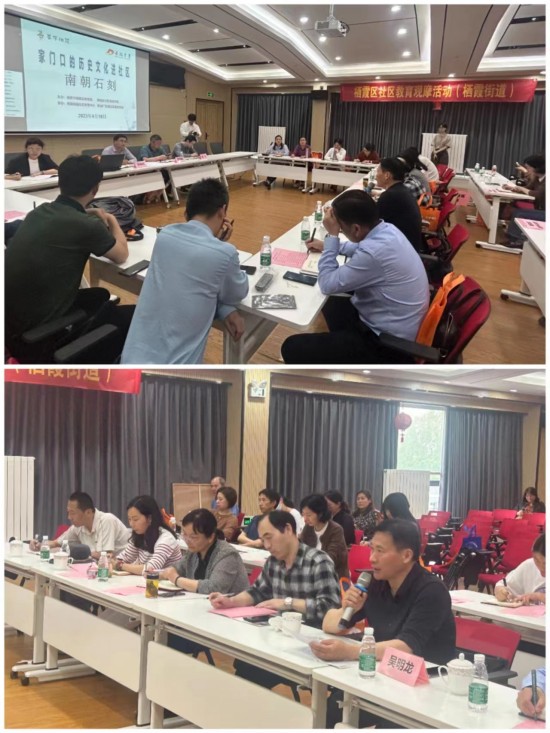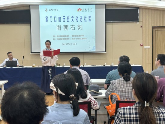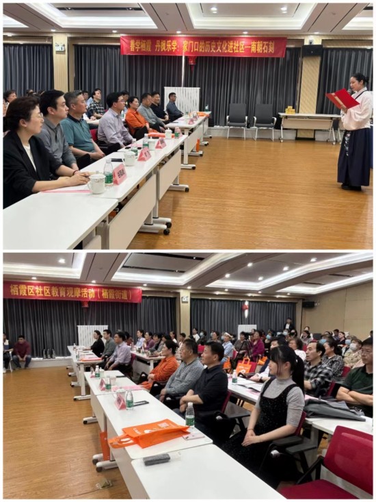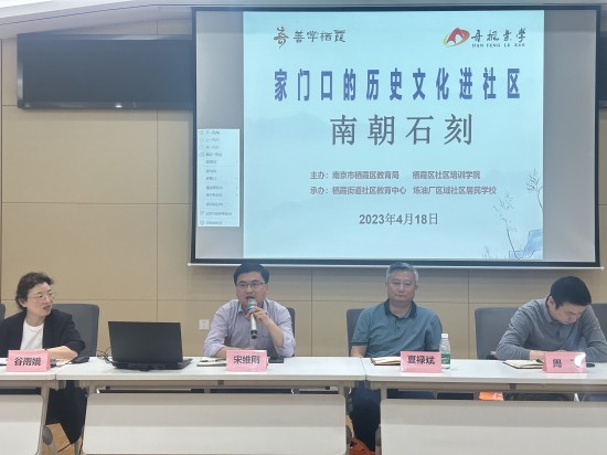 2023年4月18日下午,以“家门口的历史文化进社区——南朝石刻”为主题的社区教育观摩活动在栖霞街道炼油厂区域党群服务中心五楼会议室举办。栖霞区教育局副局长宋维刚、区职社科科长夏禄斌、副科长周飞、栖霞区社区培训学院常务副校长谷雨娥、栖霞街道文教办公室主任蔡家宝、栖霞街道炼油厂区域社区党委书记陈智燕、栖霞区各街道社区教育中心校长、老师,社区培训学院领导和老师以及炼油厂区域社区居民参加了本次活动,整个会场座无虚席。