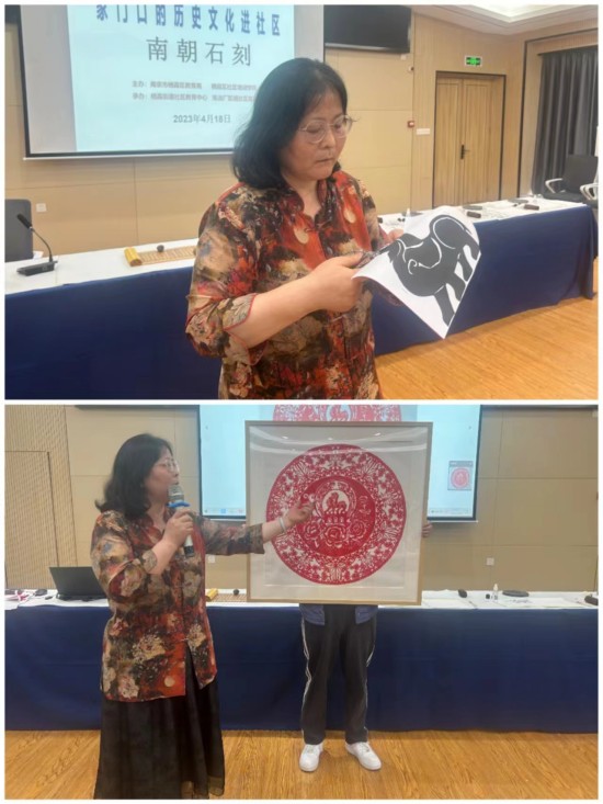 本次社区教育观摩活动有四个环节,内容充实紧凑,层层推进。一是全景概览,了解南朝石刻文化全景现状。通过观看视频,让社区居民对家门口的历史文化遗迹南朝石刻有更加深入的了解,增强社区居民对栖霞街道深厚文化底蕴的认同,让文化的灵魂在城市发展中扎根、生长,依托文化灵魂,激发栖霞文旅新城创新发展活力。二是专家讲座《南朝石刻栖霞美》,带领大家品读南朝石刻文化历史经纬,切实感受弘扬中华文化的重要意义。三是石刻拓片,体验南朝石刻文化艺术魅力。身穿汉服的社区小学生现场展演古老的传统技艺——石刻拓片,亲身感受南朝石刻辟邪的美感与艺术价值。四是文化创意,融合南朝石刻文化艺术创作。栖霞街道江苏省级“丹枫乐学剪纸工艺坊”名师工作室骨干成员闻红权老师通过一把剪刀,现场教授社区居民剪出雄壮于飞的辟邪神兽并解读自己融合南朝石刻文化创作剪纸作品《大美南京,春暖花开》,让居民切实体验到南朝石刻文化与剪纸技艺的艺术魅力,表达栖霞人民期望社会和谐安定、生活美满幸福的心愿,从而进一步坚定民族文化自信,抒发爱家乡、爱祖国的情怀。