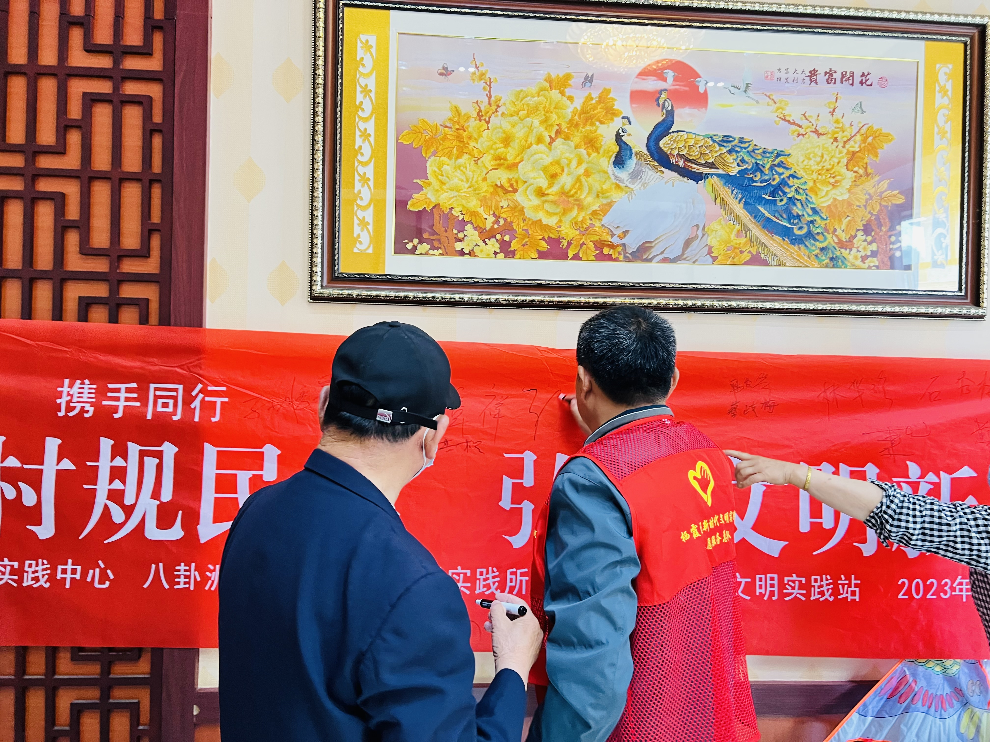 东江村新时代文明实践站开展“村规民约”主题宣讲活动,志愿者向大家介绍村规民约的重要意义,引导村民群众践行社会主义核心价值观,用通俗易懂的语言,向村民群众详细讲解了村规民约的主要内容,引导村民群众从自身做起,倡导爱护公共财产、共同维护村庄整洁、红白喜事从简、崇尚科学、反对迷信、家庭和睦、团结邻里等,大力宣传推进村规民约,争做文明新风气的积极倡导者和自觉实践者。活动后,村民们纷纷在条幅上签上了自己的名字,承诺用村规民约约束自己的行为,带动亲人、邻居、朋友一起弘扬社会新风,破除陈规陋习。网格员、志愿者下沉网格挨家挨户宣传村规民约。