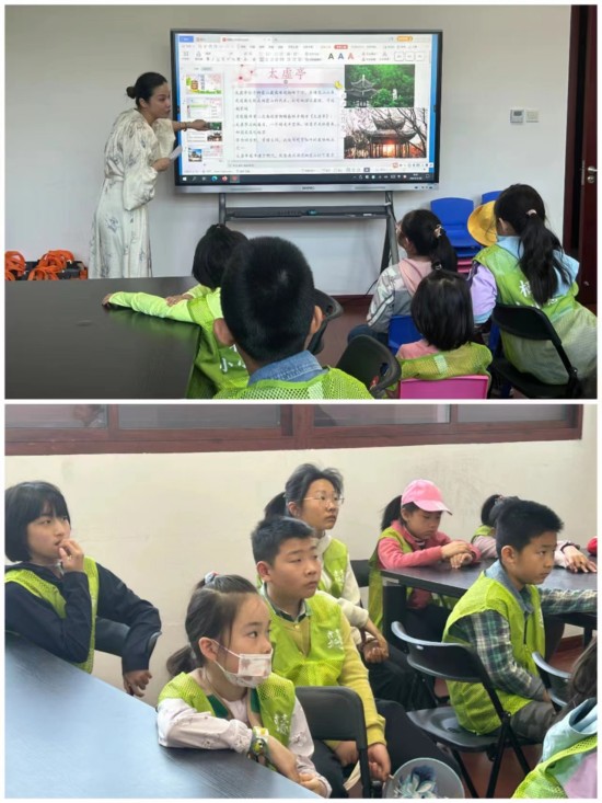 教室里,老师正在认真上课,孩子们专心致志地听讲着,了解了亭台楼阁是中国建筑的灵魂所在,栖霞山风景区内有许多亭子,著名的有太虚亭、碧云亭、试茶亭、桃花扇亭、珍珠泉亭……它们形态各异,千姿百态。亭子不仅供游人休息,还见证着历史的变迁,记录了时代的风云,讲述着曾经的故事,凝固了岁月的沧桑。桃花扇亭因清代剧作家孔尚任写出古典名剧《桃花扇》而得名,其坐落于栖霞山景区桃花涧西侧,砖木仿明清风格,白墙黑瓦飞檐,在众多亭子中,她更是别具一格。